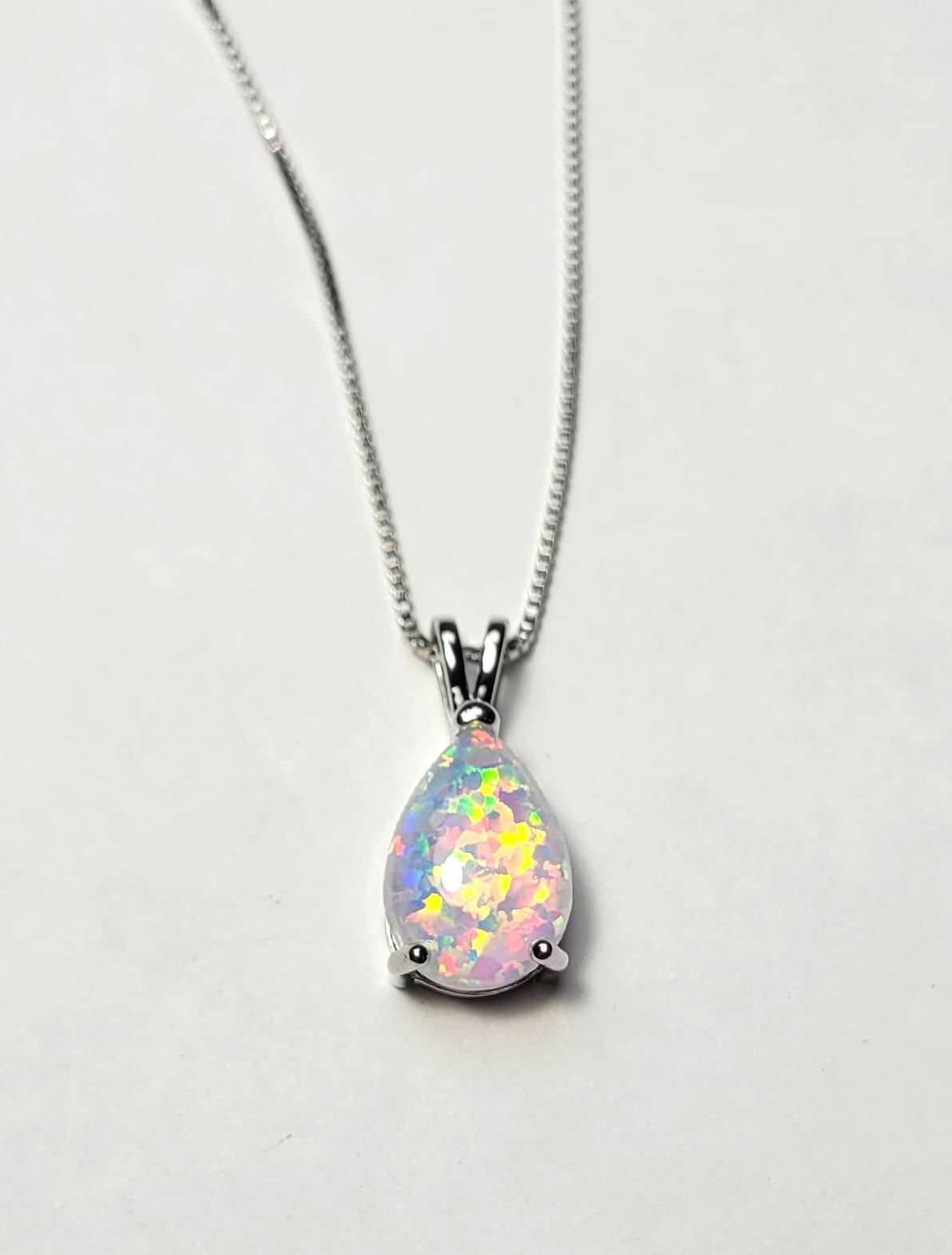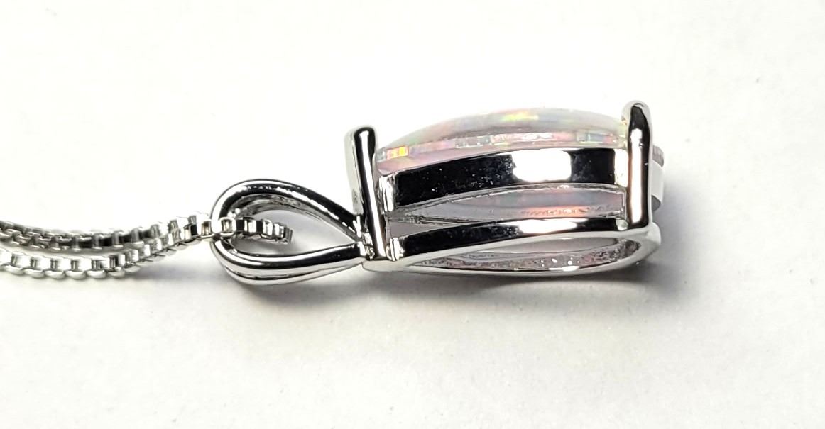 WHITE FIRE OPAL PENDANT ON 18" BOX LINK CHAIN WITH 2" EXTENDER. JEWELERY