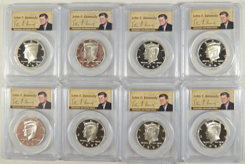 (8) SLABBED SILVER PROOF KENNEDY HALF DOLLARS PCGS PR-69 DCAM (1992, 1993, 1994,