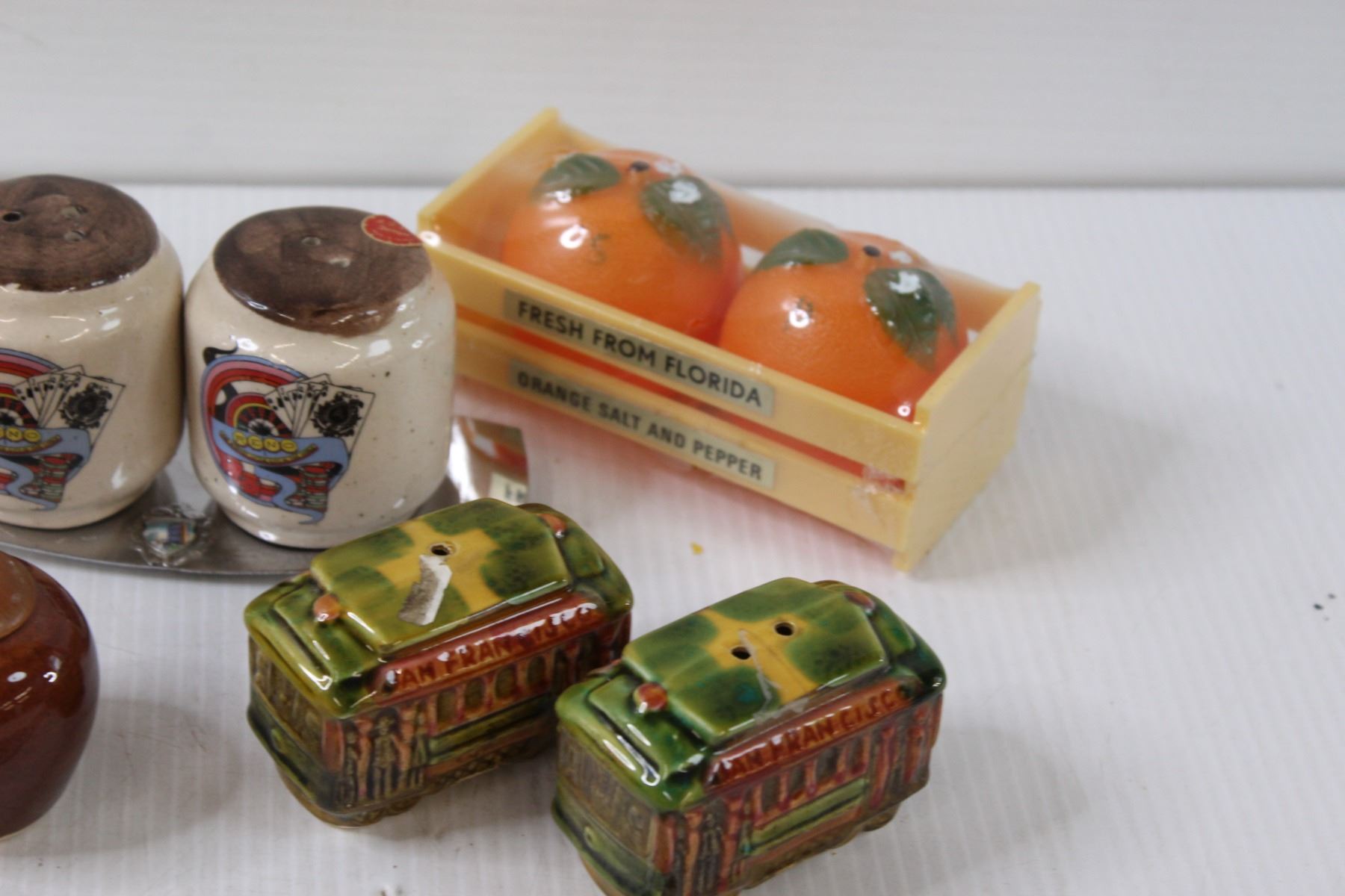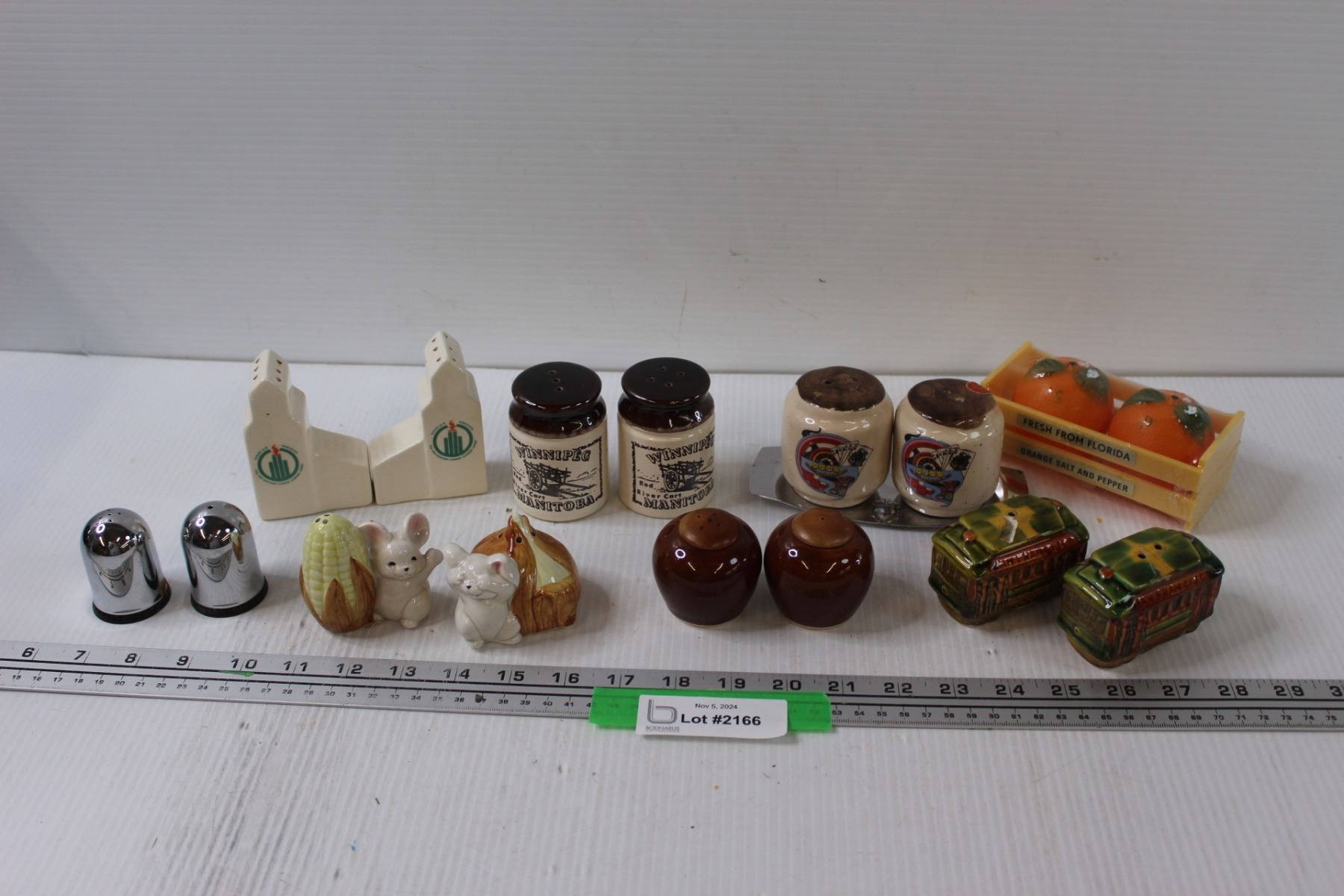 (8) Salt & Pepper Shakers - Grain Elevators, Oranges, Train, Misc.