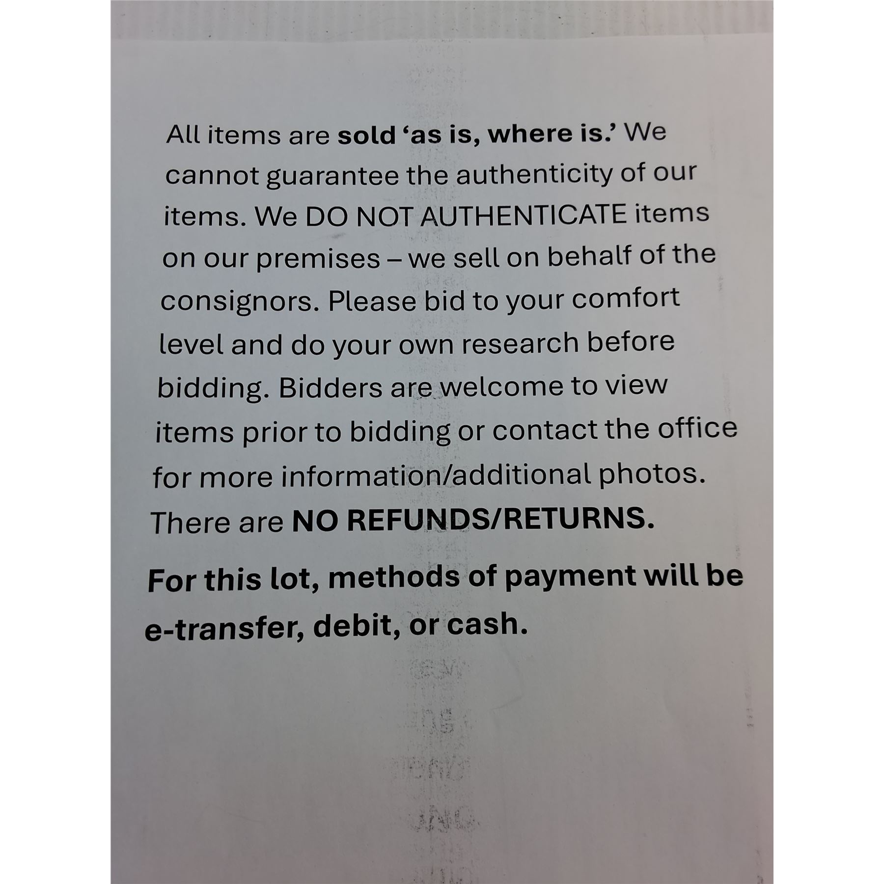 A online bidding premium may be applied to each lot purchased on the Internet. Federal GST and corresponding Provincial Sales Tax will apply to all purchases where applicable.