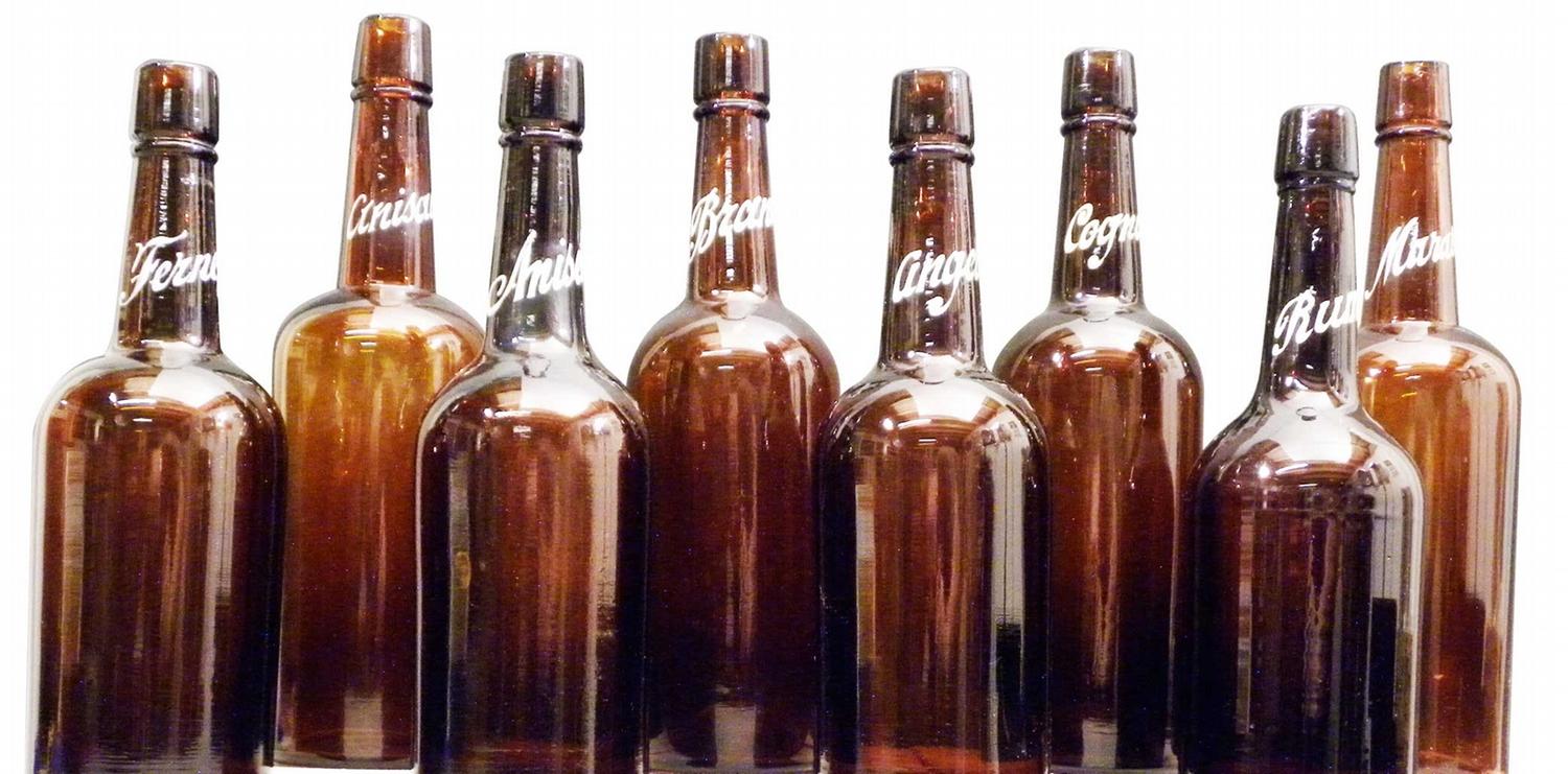 Lot of Eight Second Shelf Enamel Label Amber Liquor Bottles including Fernet, Maraschino, Brandy, Anisette, Rum, Angelica, Anisado and Cognac. No chips or cracks. 11 2/ inches tall.