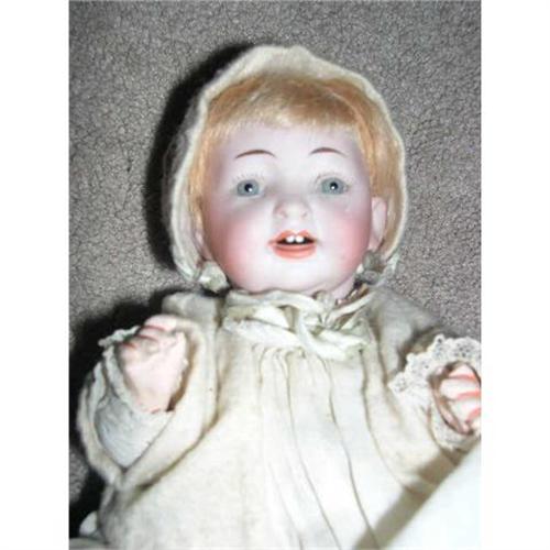 8" Set Eyes Bisque Baby Open Mouth Doll. Doll has tiny scratch on one cheek. Doll has nice old body still has red lines on fingers. Original blonde wig is still nice. Doll comes from a smoke free environment. Buyer to pay $15 for shipping, handling, and insurance. Thanks for viewing.