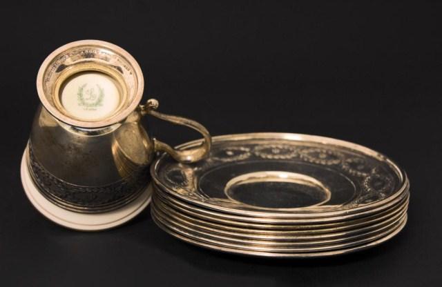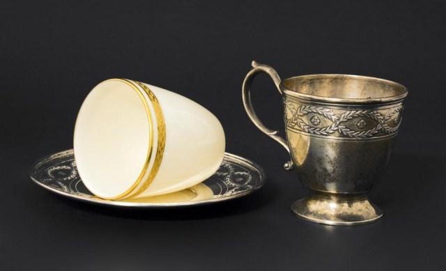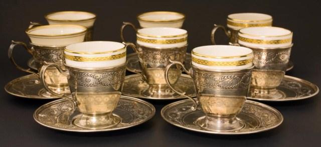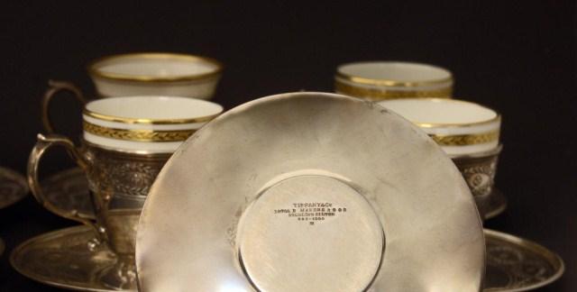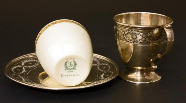 Sterling silver. Have a wreath border design and scrolled handles. Each piece of silver is marked with the Tiffany & Company marks and numbered 18705 3008. 5 porcelain inserts are marked Lenox and Tiffany & Co. 3 inserts are marked only Lenox and have a slightly different shape and design. Each cup with insert measures 2 3/4" h. Saucers measure 4 3/16" dia.