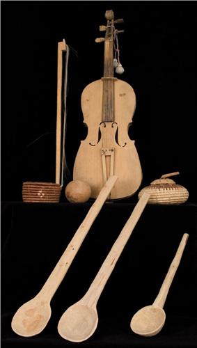 Collection of 8 Tarahumara Items. Violin and bow, 3 ladles, 1 ball, and 2 baskets. Violin is 24" long. (est $300-400)
