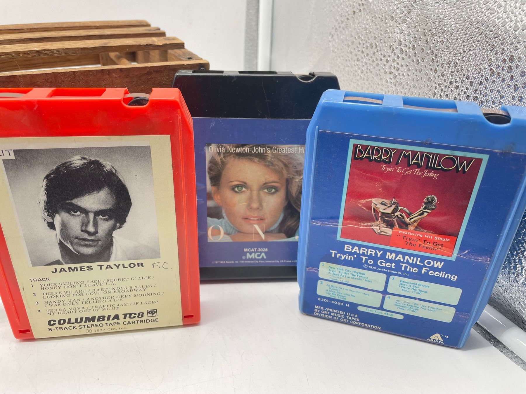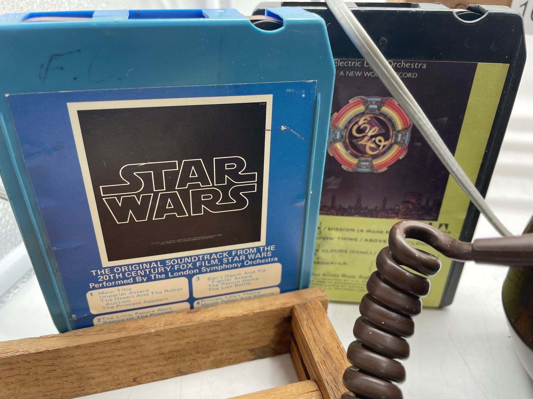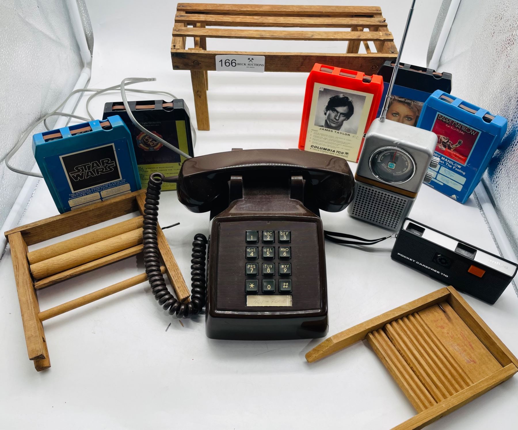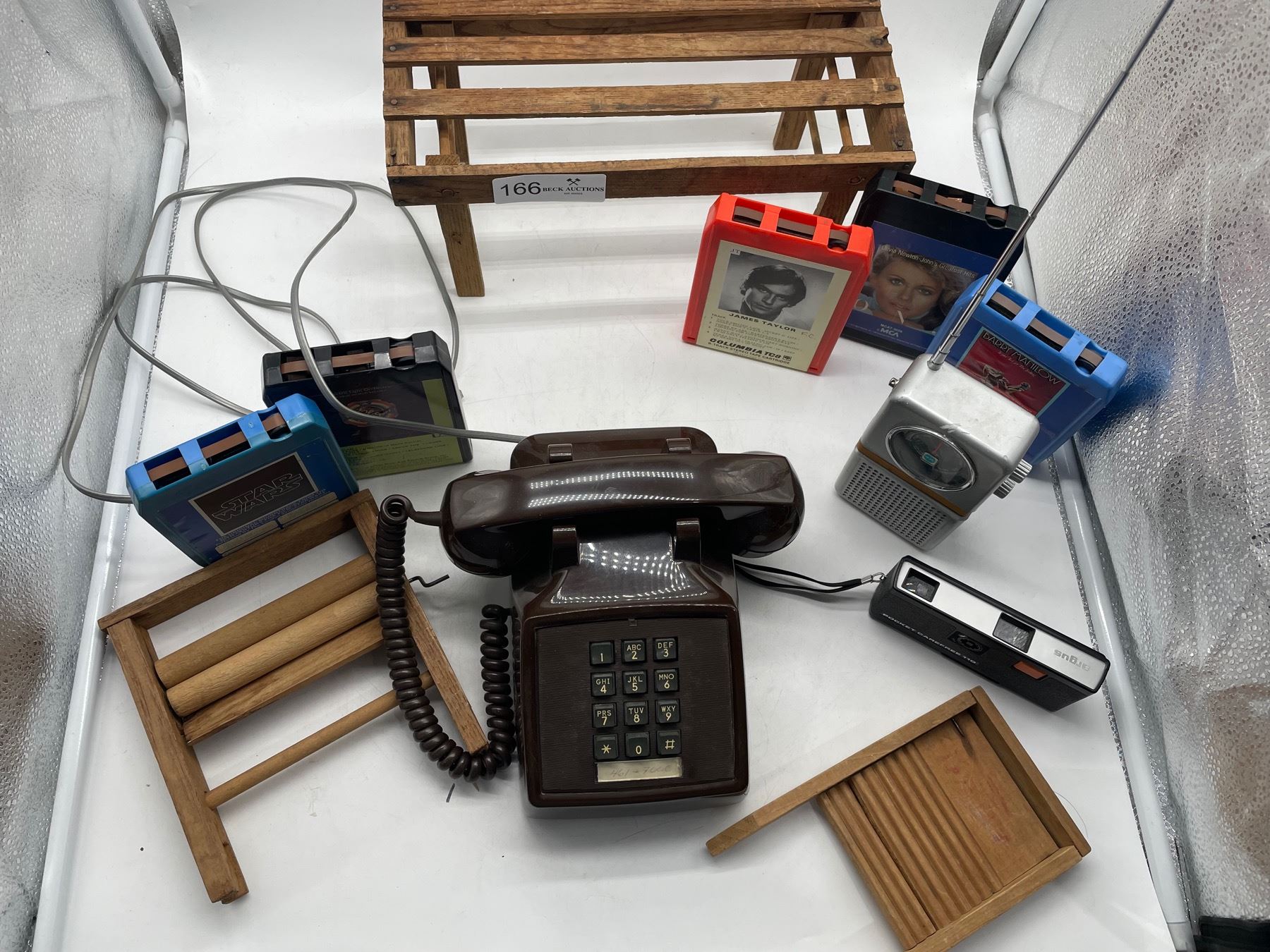 8 -Track Lot includes a landline phone (cover plate comes loose) and some doll laundry wood items (tape does not like staying upright) etc. Phone or other items not tested