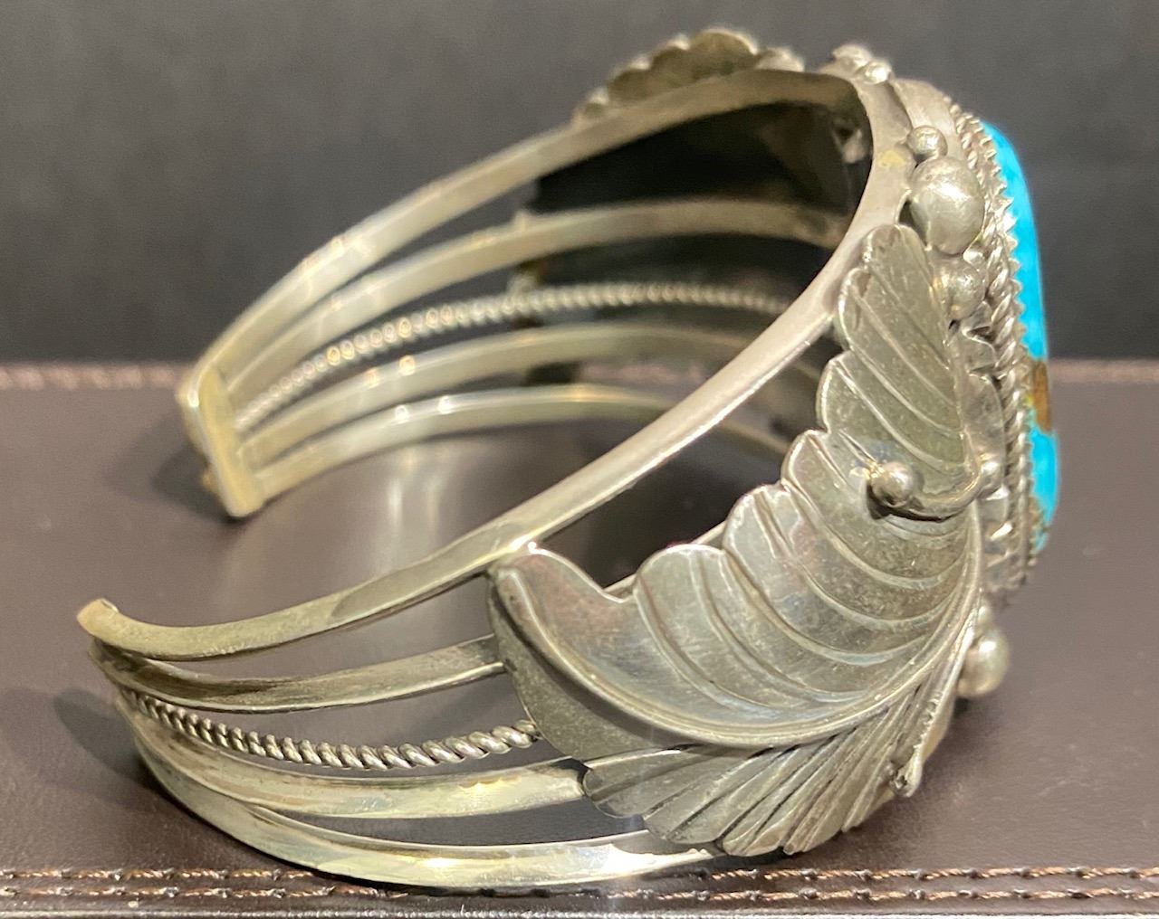 Glenda Lee Navajo Artist used a nice piece of #8 Turquoise to create this beautiful Bracelet. Measures 1 1/2"-high, 6"-Inside Measurement with a 1 3/8ths-opening. 57-grams.