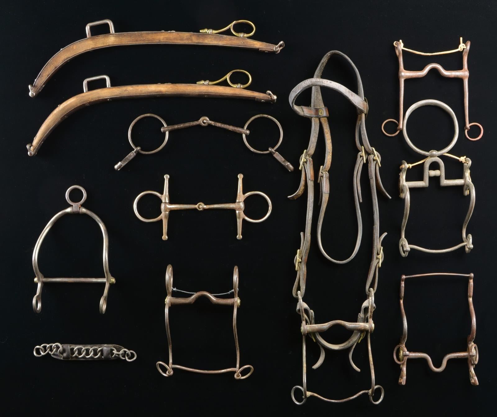 This fine lot includes 1 M1863 US cavalry bit marked "US WATERVLIET ARSENAL US". The bosses on the side are brass with "US" in the center of a circle. / 1 US M1859 cavalry curb bit used for training young horses. The bosses on the side are brass with "US" in the center of a circle. / 1 Museman & Brother circa 1920 breaking bit M1212. / 1 US cavalry M1909 curb bit marked "US" & "W.L" which stands for White-Horse Lecompte. / 1 US M1911 artillery snaffle bit marked "US" & "RIA". / 1 US cavalry M1885 watering bit. / 1 US cavalry M1874 Shoemaker bit. / 1 US cavalry M1874 Shoemaker bit with complete headstall. / 1 US cavalry M1892 curb chain & strap. / 2 Small iron & wood hames likely for a draft horse. CONDITION: all bits & other items appear fully functional and complete with expected wear but no abuse or breaks. PROVENANCE: From the Collection of James B. Taylor. (02-19917/BF). $800-1,200.