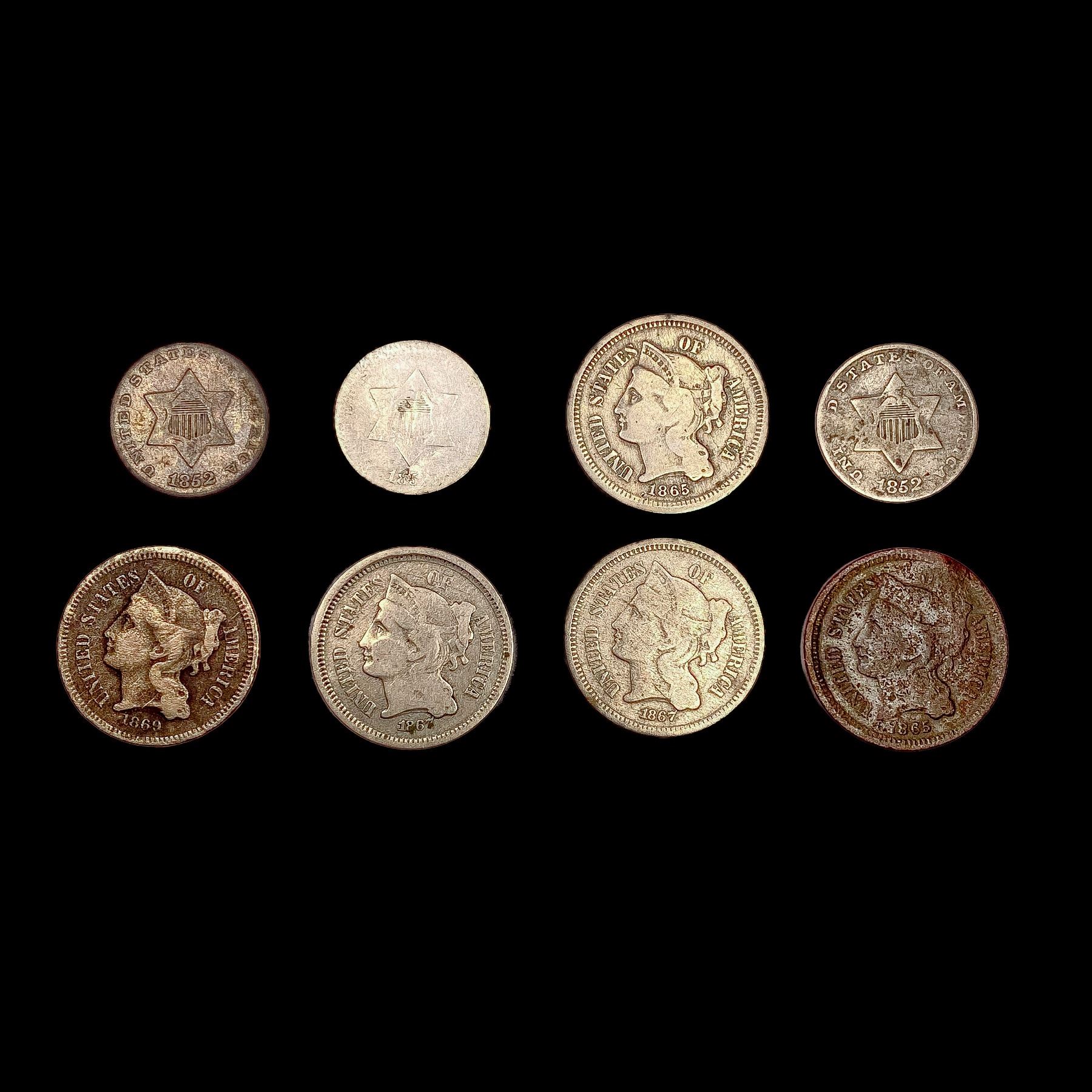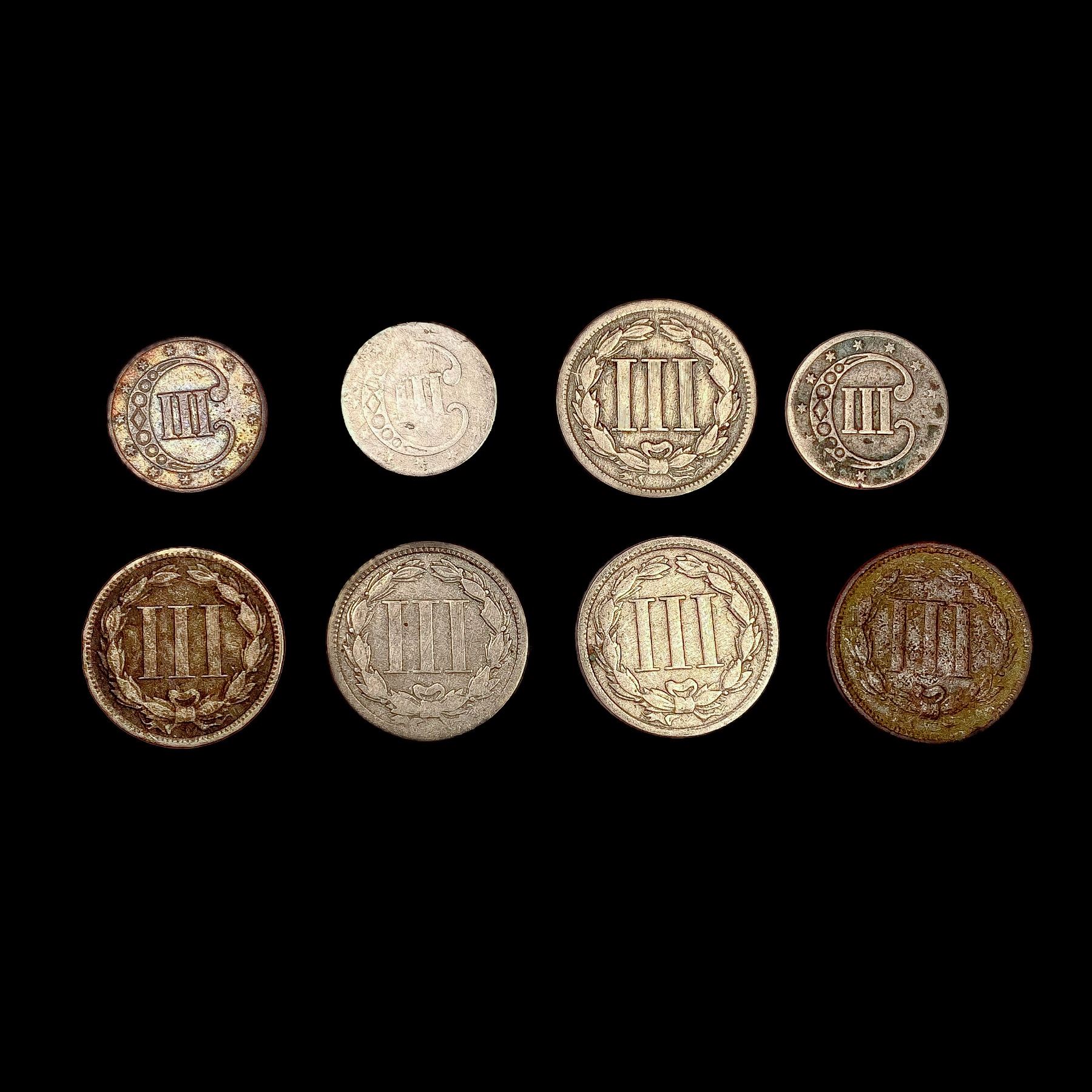 (8) Varied US 3 Cents ((3) 1852, (2) 1865, (2) 186