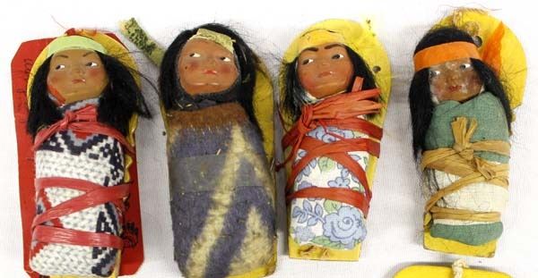 8 Vintage Skookum Mailer Dolls, longest measures 1.75'' x 4'', 3 have the original mailing tags (2 have writing on them and one is blank)