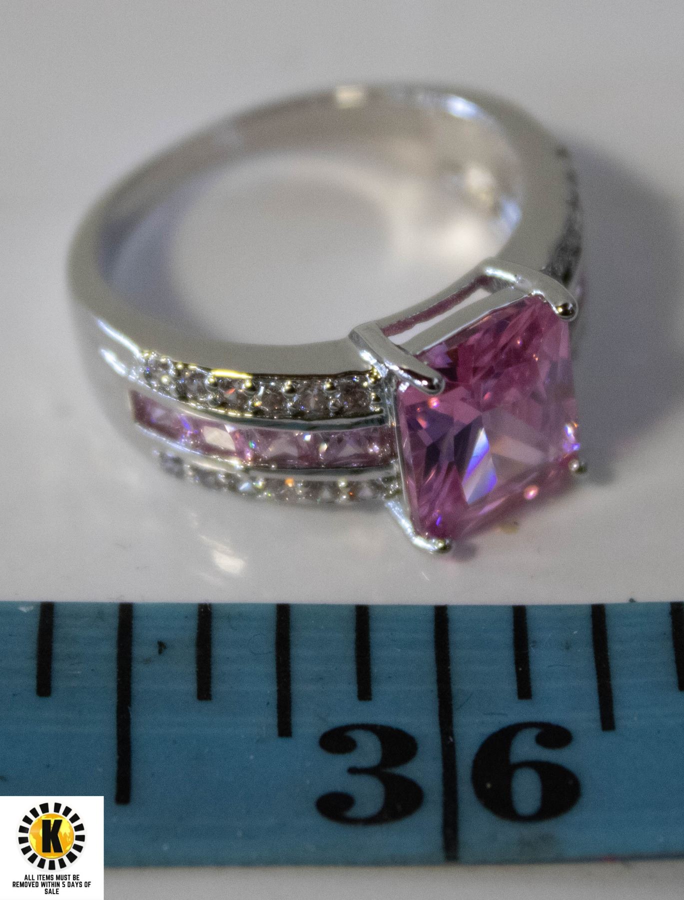 PRINCESS CUT PINK CZ?S ON EITHER SIDE WITH CLEAR ACCENTS RING SIZE 8