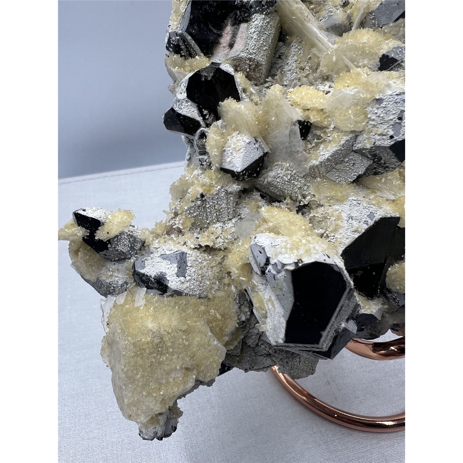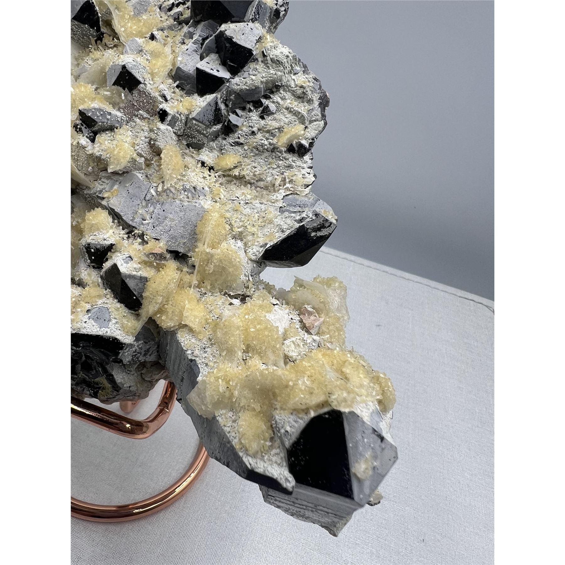 8 X 8 INCH BLACK CRYSTAL WITH YELLOW CALCITE QUARTZ SPECIMEN ON STAND