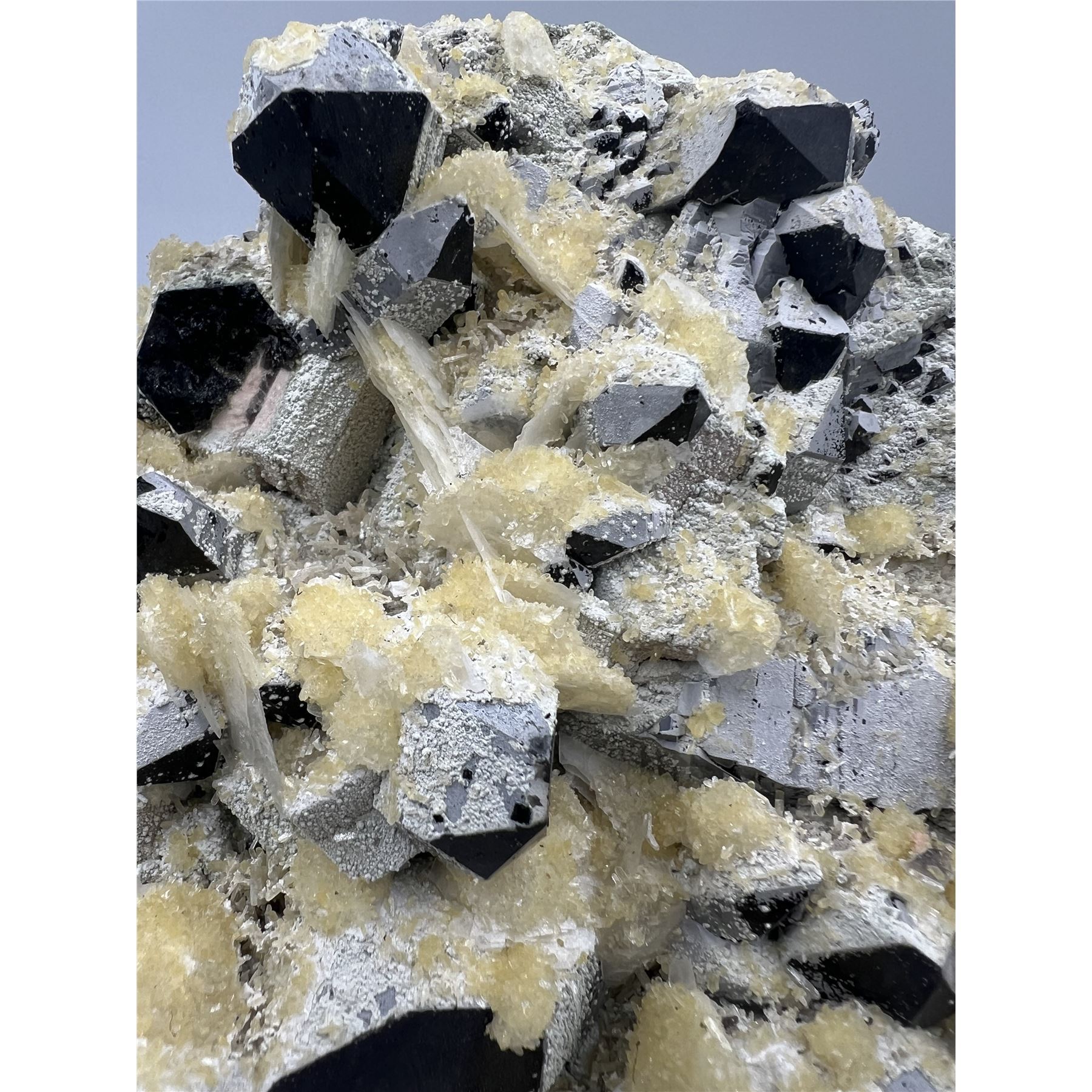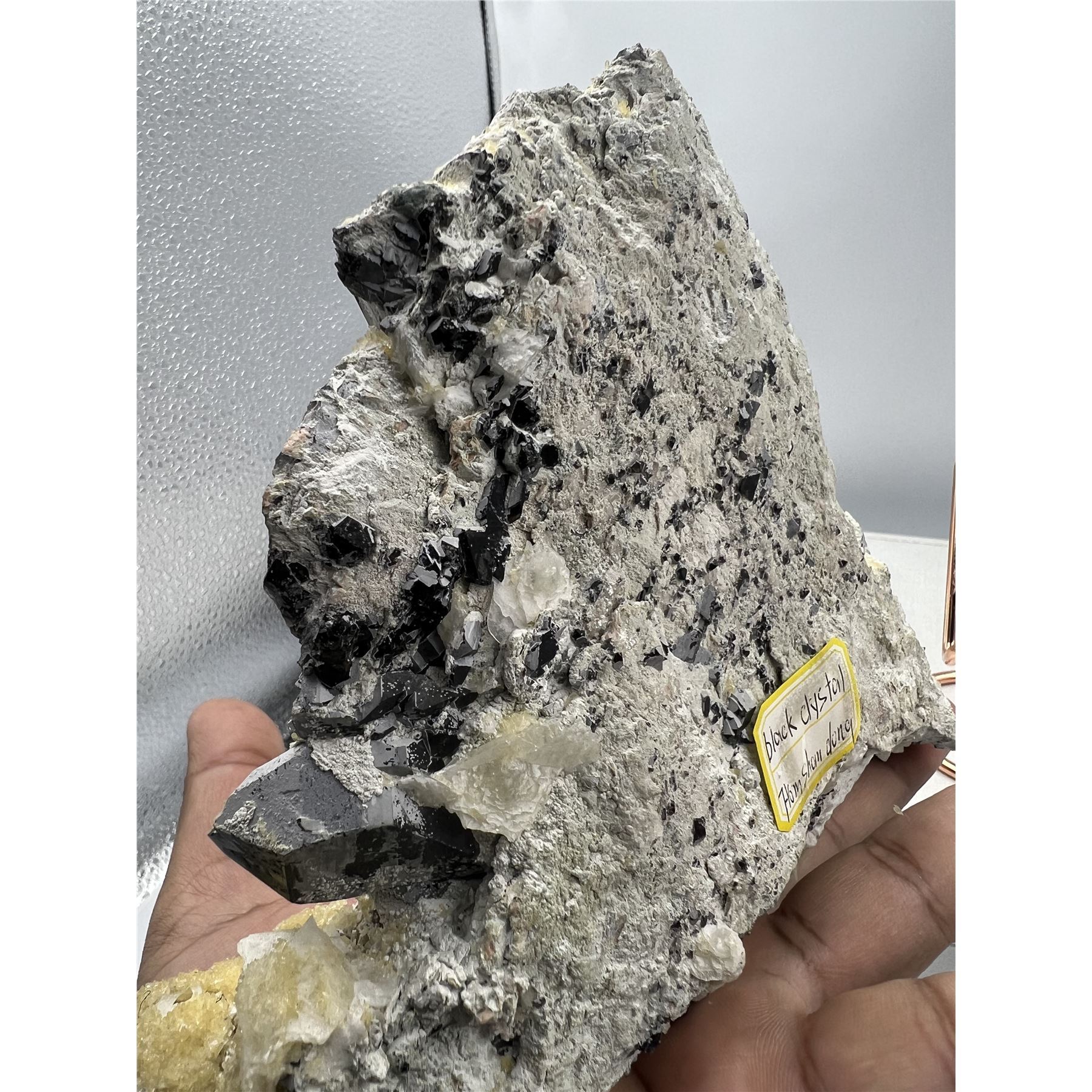 8 X 8 INCH BLACK CRYSTAL WITH YELLOW CALCITE QUARTZ SPECIMEN ON STAND