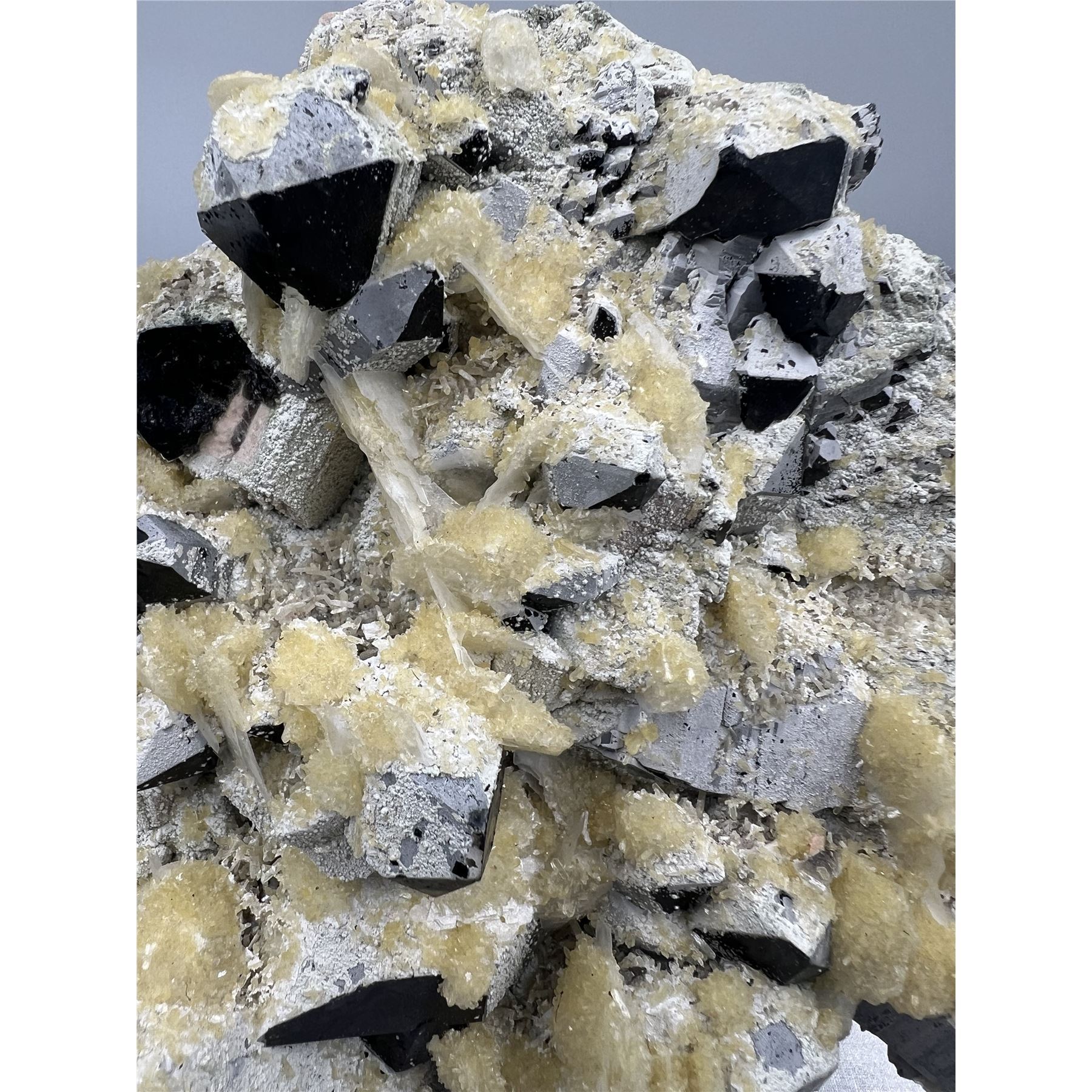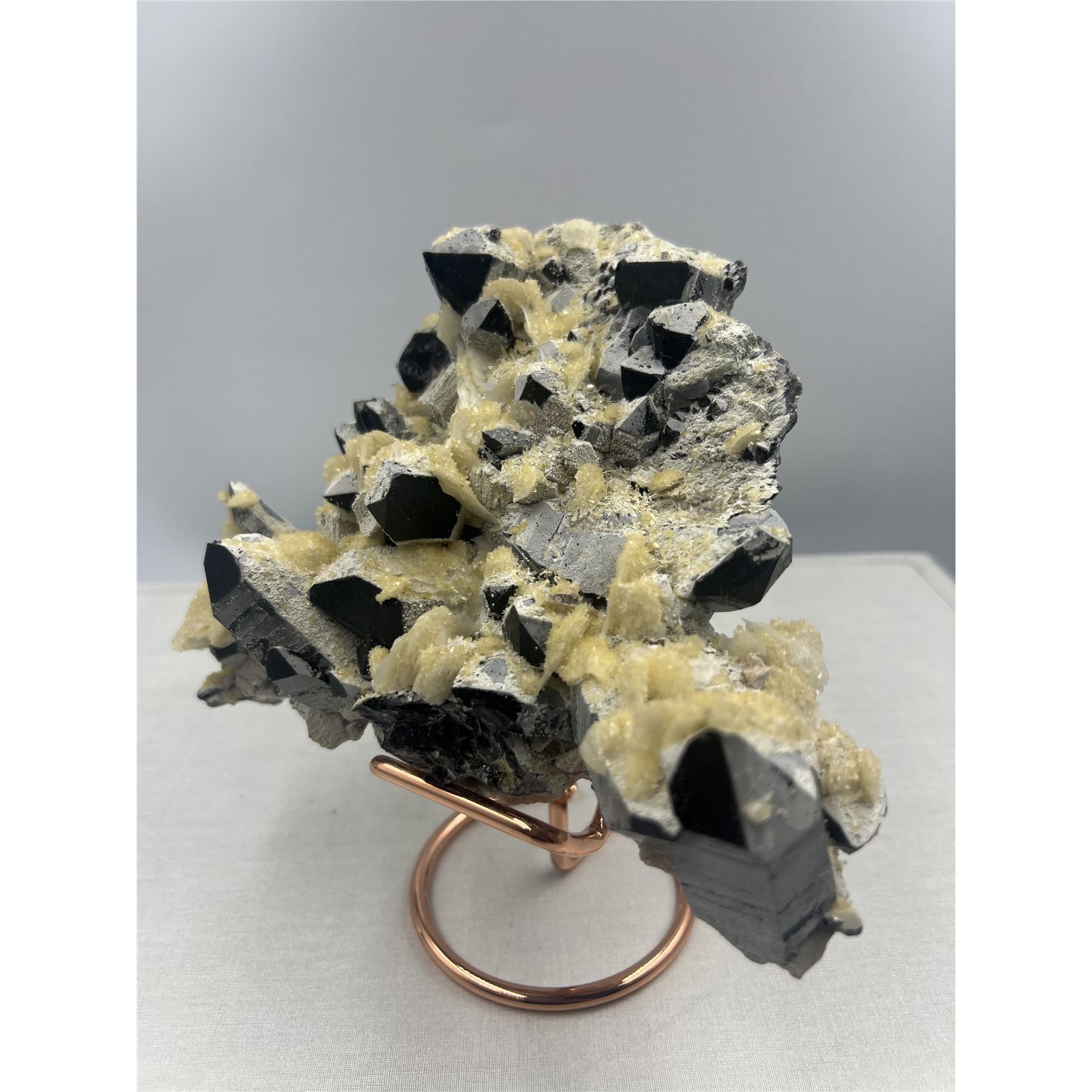 8 X 8 INCH BLACK CRYSTAL WITH YELLOW CALCITE QUARTZ SPECIMEN ON STAND