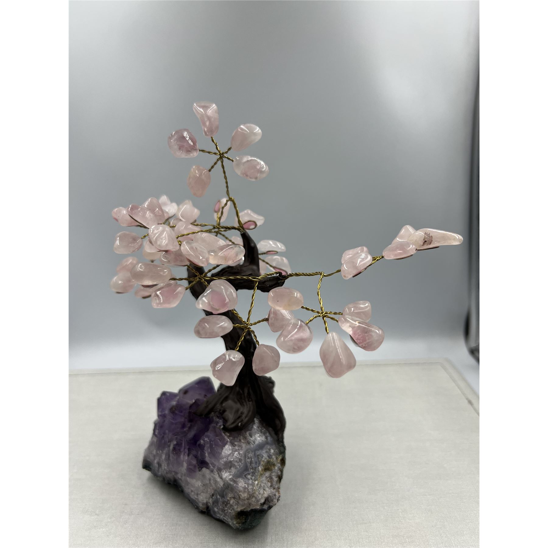 Handmade Rose Quartz Gemstone Tree w/ Amethyst Cluster base, 8 X 8" INCH tall.