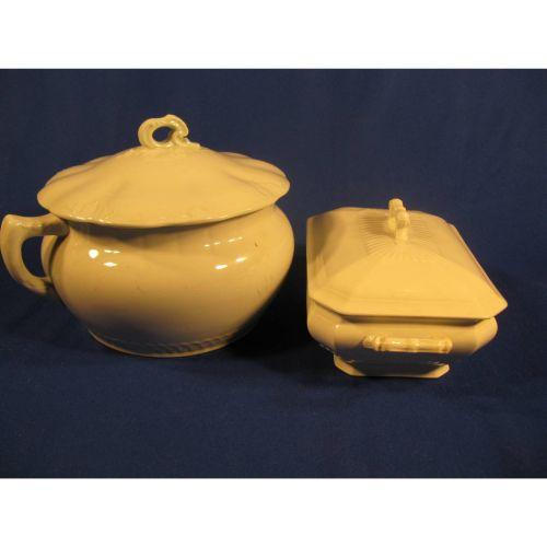 8" chamber pot w/lid, marked “Virginia", some crazing, plus covered dish marked, Wood and Son