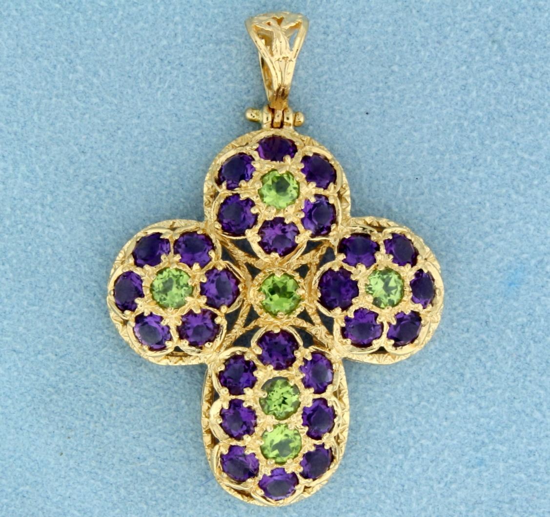 In 14k yellow gold. Contains twenty six 4mm natural amethyst gemstones with bright purple color and excellent clarity. Also contains six 4mm natural peridot gemstones with excellent clarity and color. 2" long with bale. 10.6g.