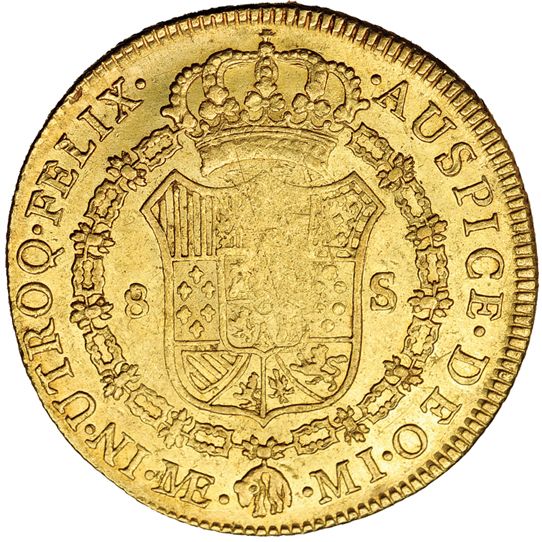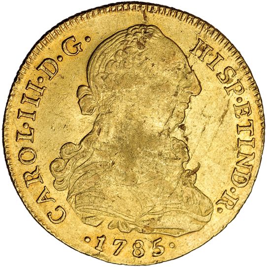 8 escudos. 1785. Lima. MI. VI-1612. Hojitas en el anv. y vano en el rev. R.B.O. MBC+. Rara.