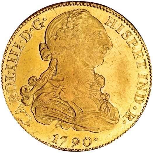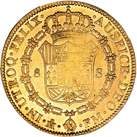 8 escudos. 1790. México. FM. Ordinal IIII. VI-1326. Acuñación floja. Pequeñas marcas. R.B.O. MBC+. Muy escasa.