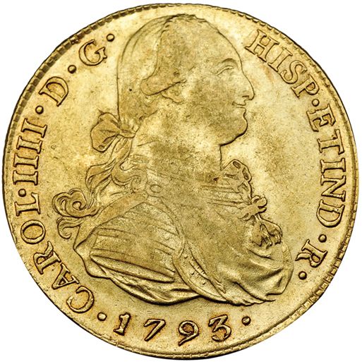 8 escudos. 1793. Lima. IJ. VI-1299. Golpecito en la gráfila. MBC+. Escasa.