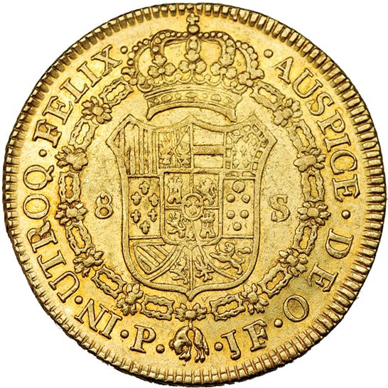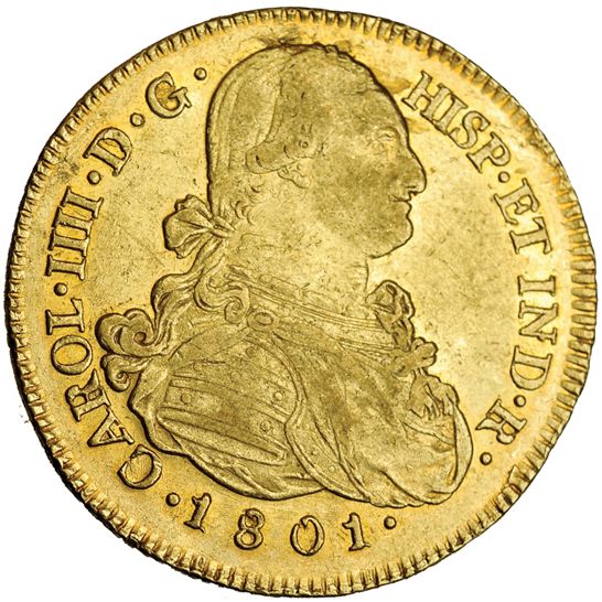 8 escudos. 1801. Popayán. JF. VI-1381. Hojitas en el anv. R.B.O. MBC+.