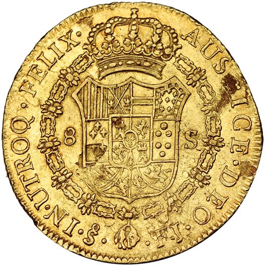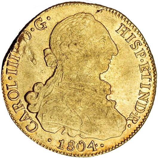 8 escudos. 1804. Santiago. FJ. VI-1430. Cospel algo irregular. Hojas. R.B.O. MBC+/EBC-.