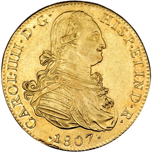 8 escudos. 1807. México. TH. VI-1344. Defecto de acuñación en el canto a las 6/7. R.B.O. EBC-.