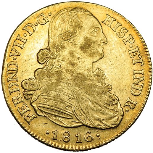 8 escudos. 1816. Nuevo Reino. JF. Sin punto después de IND. VI-1505 vte. Vano en el rev. MBC.