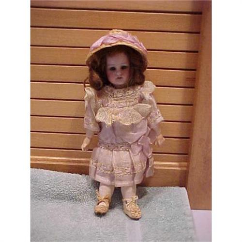 This adorable little doll is Factory Original!! Her outfit is pale purple silk organdy, with creamy cotton beading and silk ribbon. The dress is lined with muslin and is fraying on one sleeve, very minor. The lace is in good condition with a couple dark areas. Her mohair wig still retains it's curl. There is one area where the mohair has come unglued from the pate; it is up under the hat. Her straw hat is decorated with pale purple silk ribbon, which may have been replaced. The hat has one area where it is coming unsewn; it is in the back. Her underwear consist of a cotton petticoat and bloomers. She has silky cream socks and original shoes! One shoe is darker due to dirt. This doll has the most fabulous body! It is multi-jointed and not one area of crazing or dirt. She still has her finger lines and soft creamy flesh color. Her eyes are blue and they sleep. She is just wonderful! Make an offer if not in an auction.