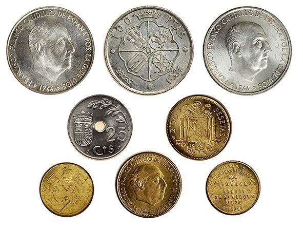 8 monedas: 25 céntimos, 1937; módulo peseta (2), pruebas de acuñación La Naval, 1948, coincidente y no coincidente; 2'50 pesetas *54 y 56; 100 pesetas *66 y 67; 100 pesetas *66, falsa en metal plateado. De MBC+ a SC.