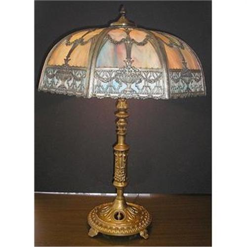 Here is a larger vintage 8 panel lamp with intricate metal overlay. Each panel has 2 different pieces of stained glass. The lower section is a pretty powder blue color. The upper sections are opalescent candy colored curved glass. The base of the lamp is an intricate art metal that has been painted. This is truly a great centerpiece lamp.