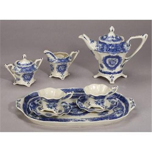 Blue and white transferware porcelain that features floral design with bird accents on front and back at the top. Lids are removable. Dimensions: Tray:16"w, 11"d; Teapot:8.5"h, 10"w, 6"d; Creamer:4.5"h, 6"w, 4"d; Sugar:5"h, 6"w, 4"d; Cup:2.5"h, 5"w, 3.5"d; Saucer:6"diam