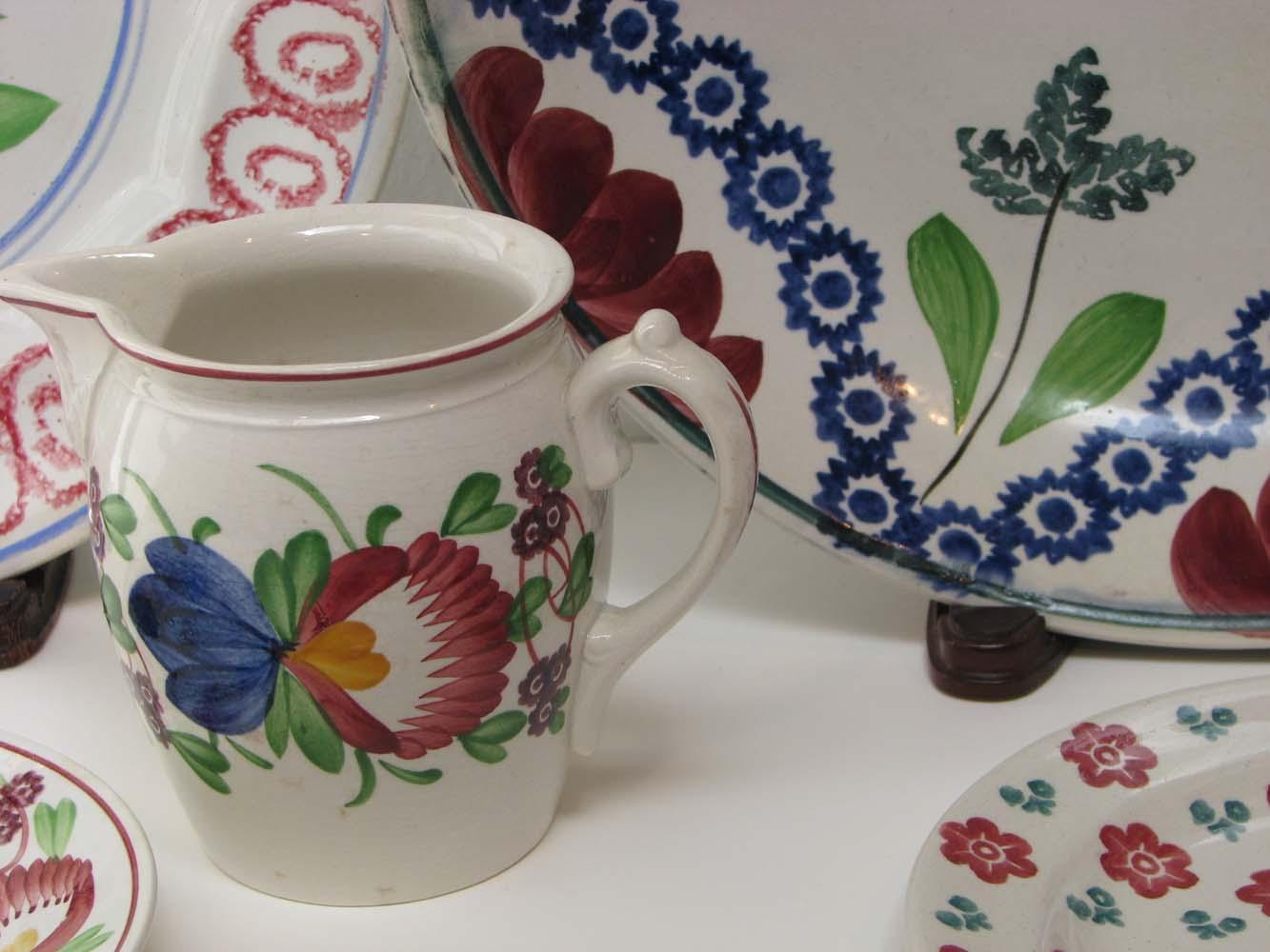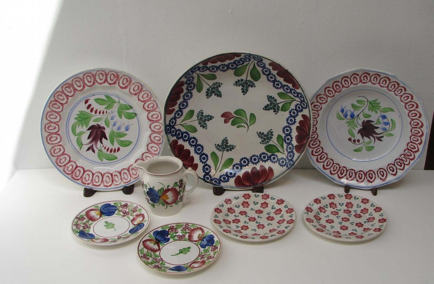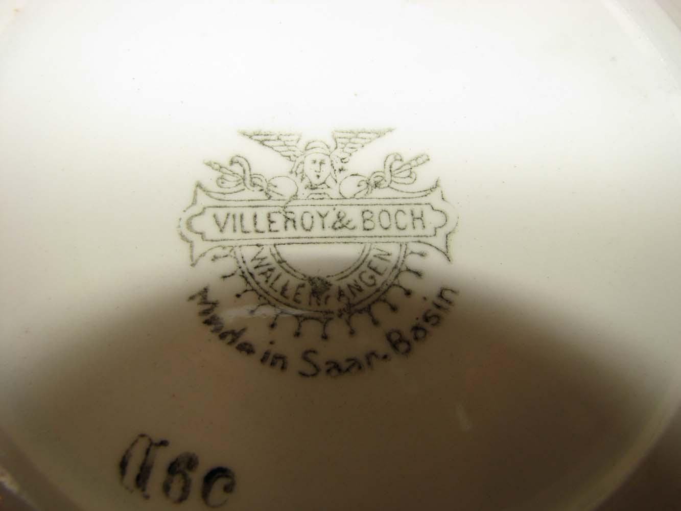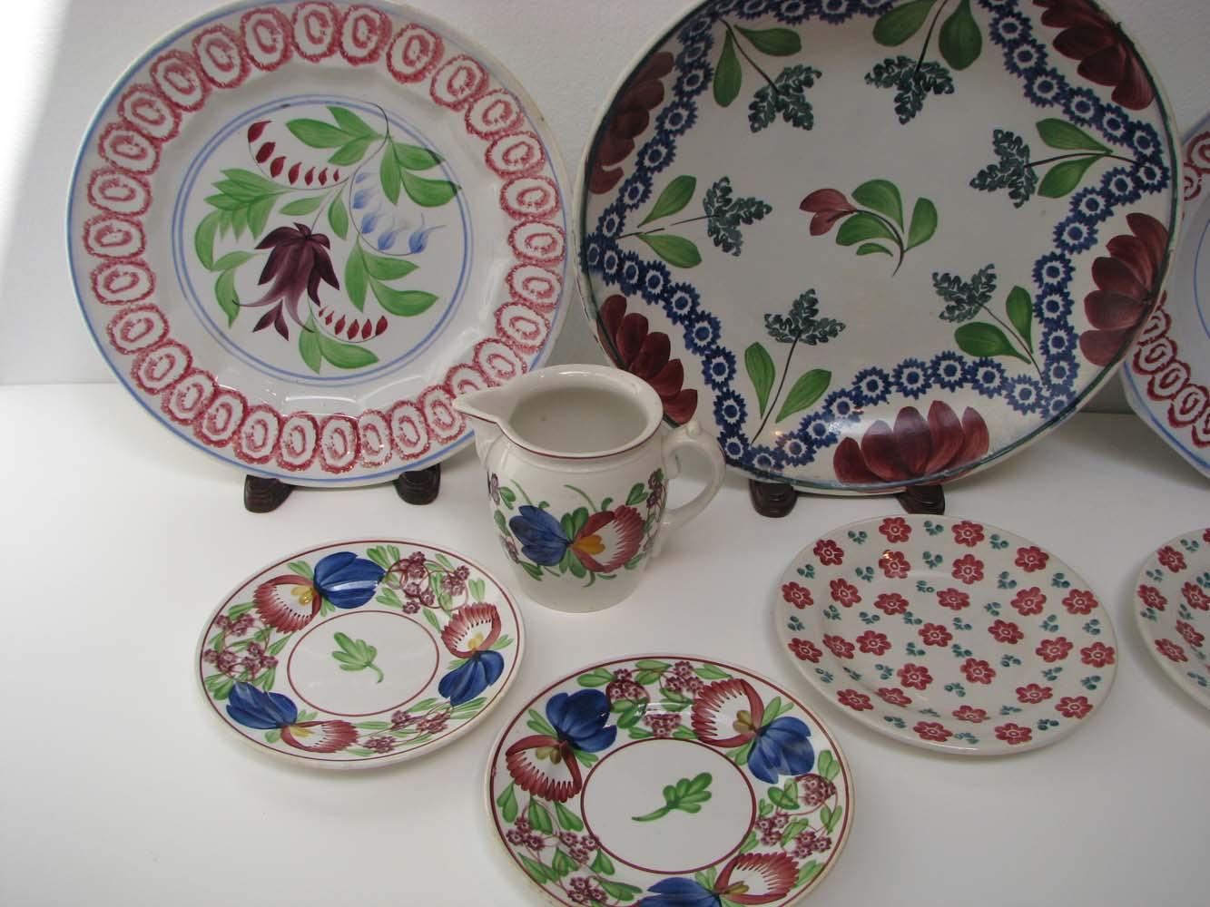 Title: Assorted Sticks Spatter including: pitcher (Villeroy & Boch), two saucers (Villeroy & Boch), two bread plates, two serving bowls, serving plate (thistle and lilly of the valley)