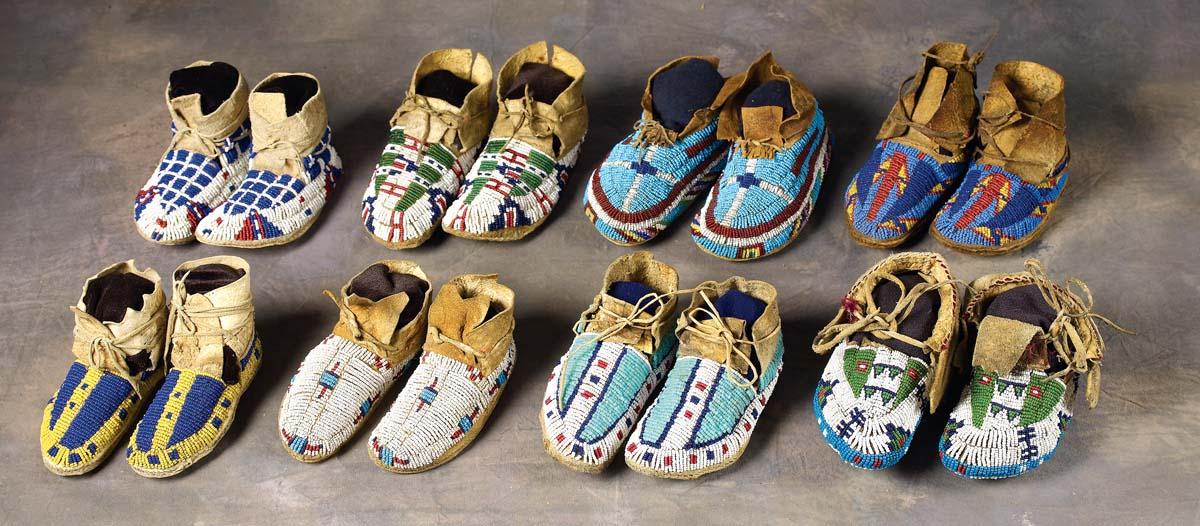 From 5" to 7" in length, all multicolored geometric designs on native tanned hide. One pair beaded on the bottom. All excellent condition, c 1880