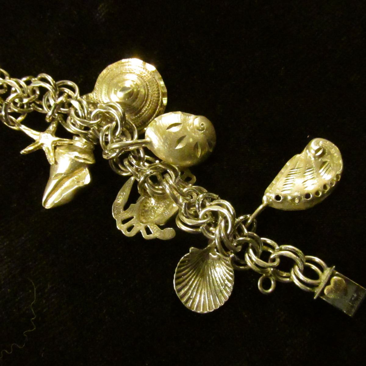 8” silver double ring link charm bracelet with 14 shells and whales sterling charms. Well made with an extra safety chain, 37.1 grams