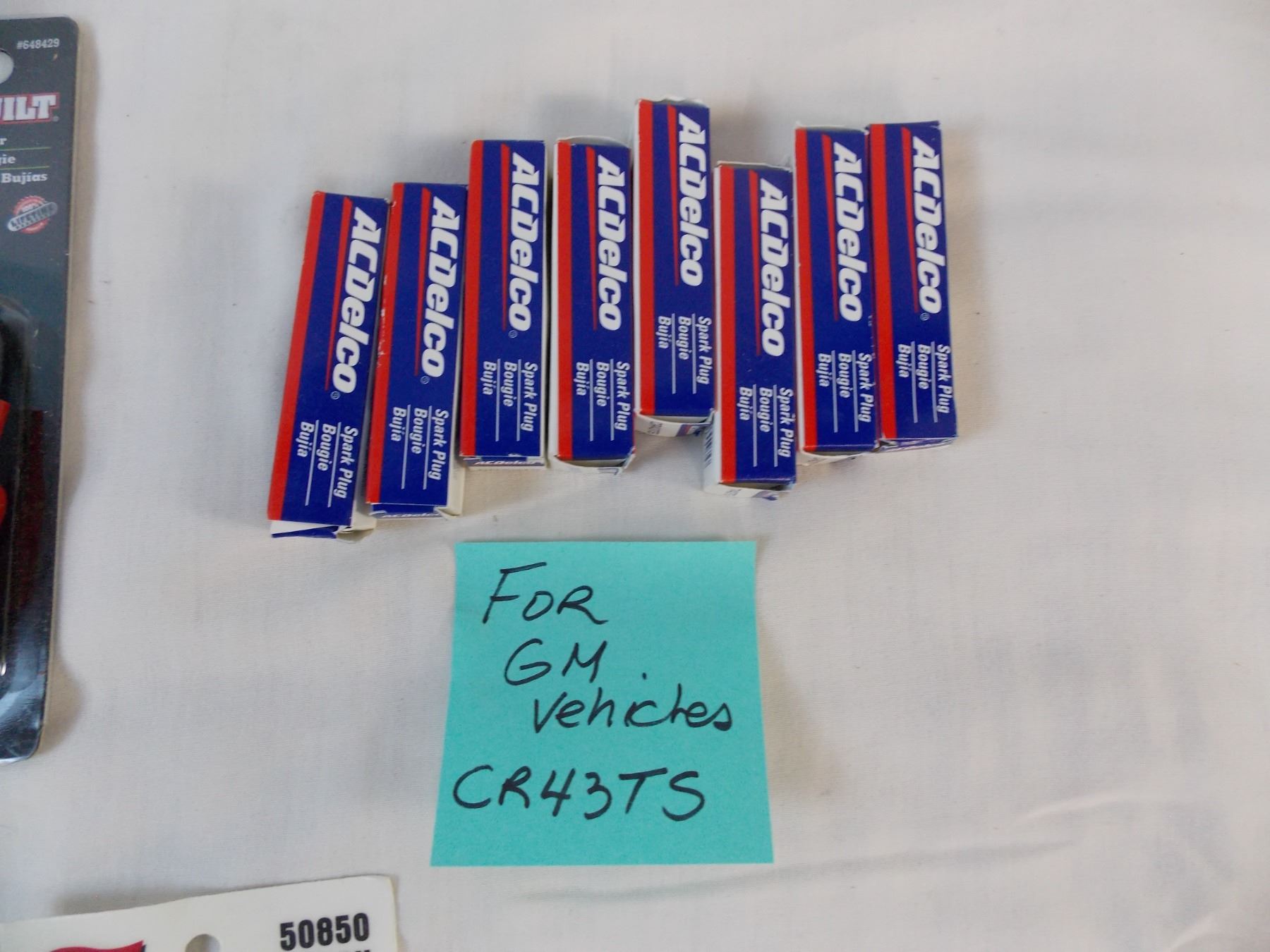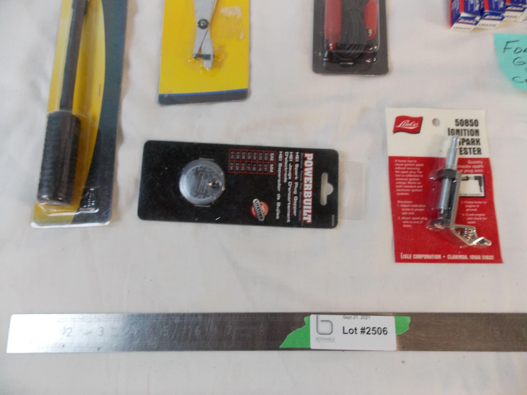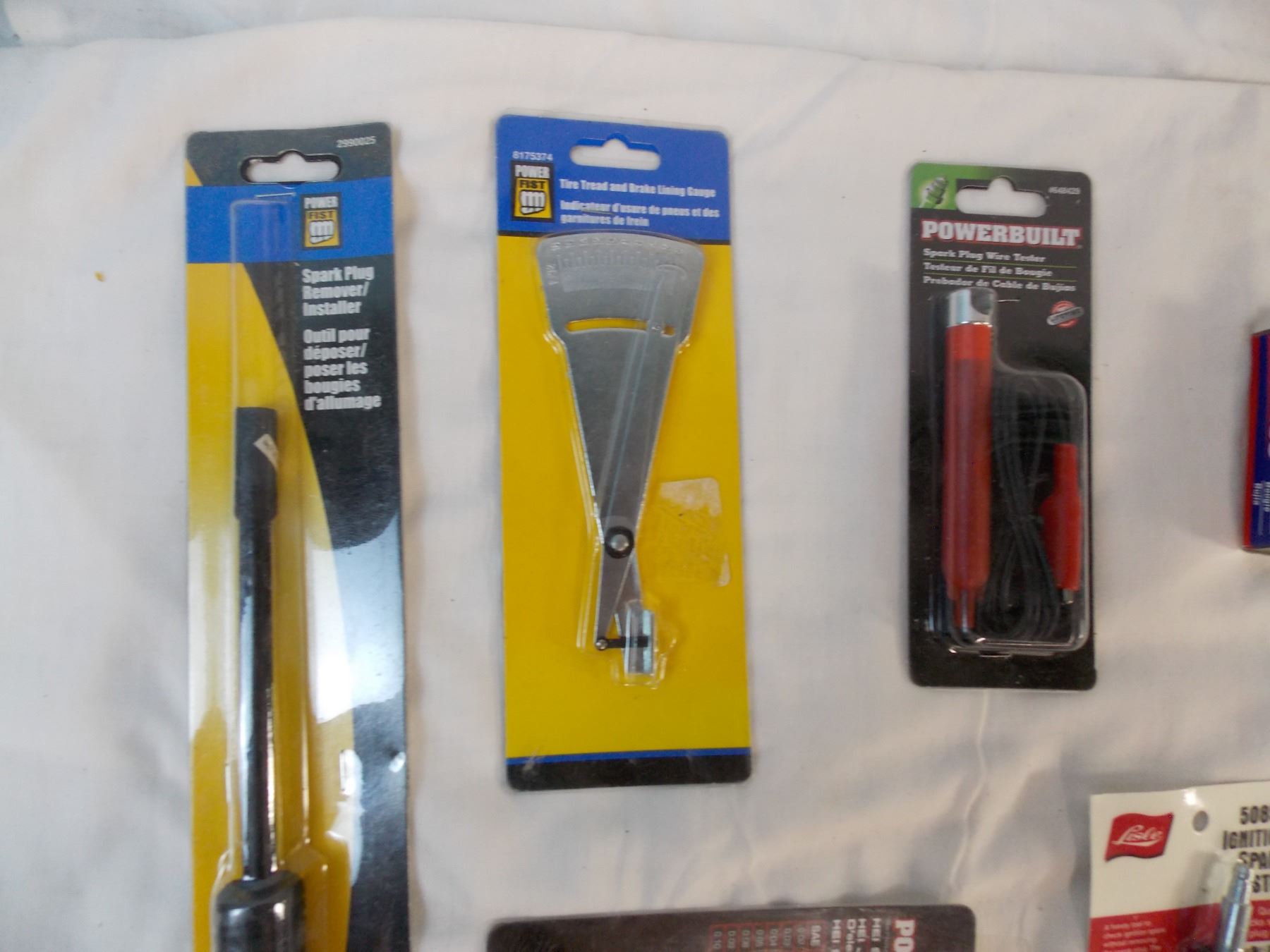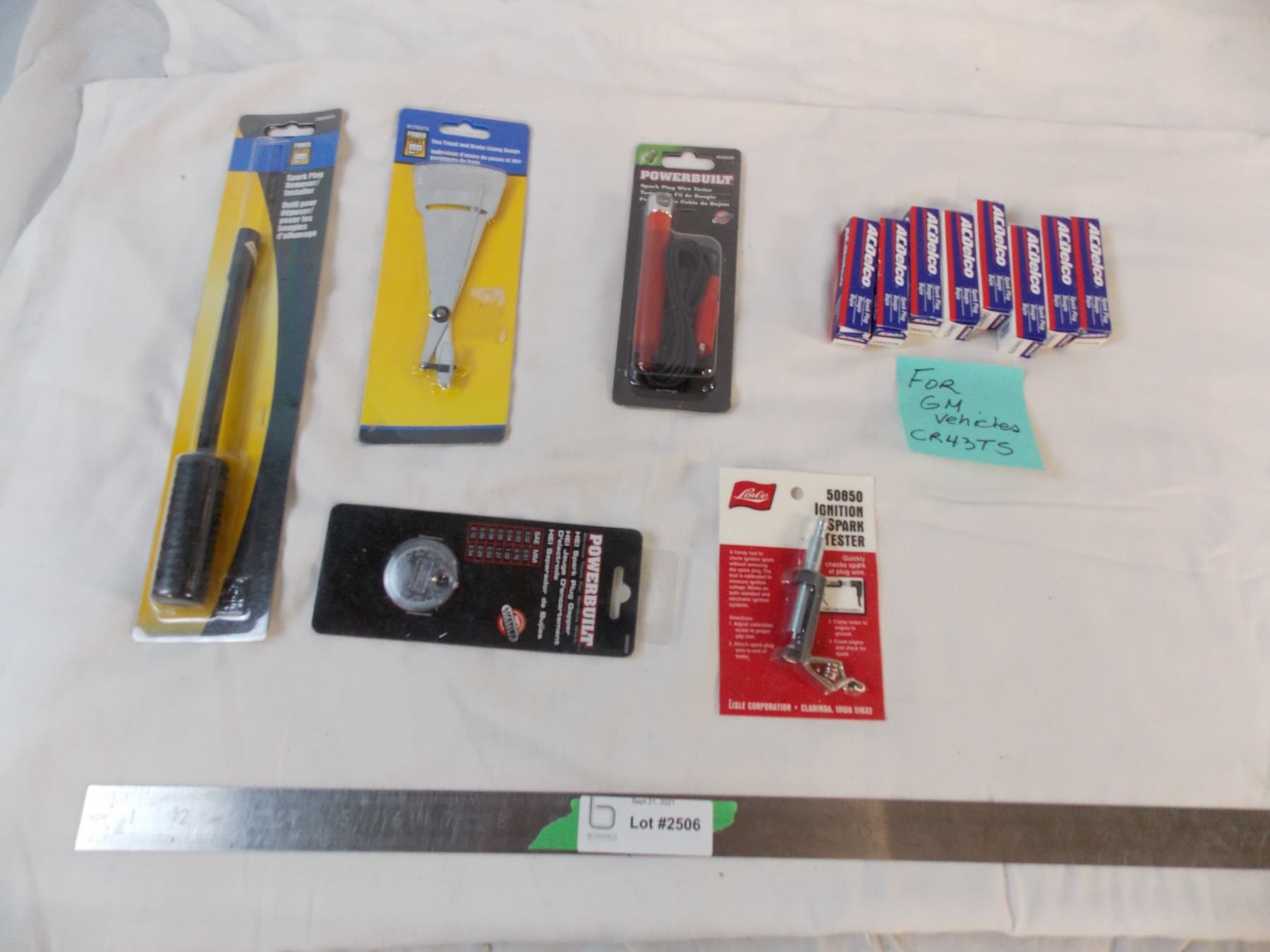 8 spark plugs, tire tread + spark plug gauges, spark plug tool