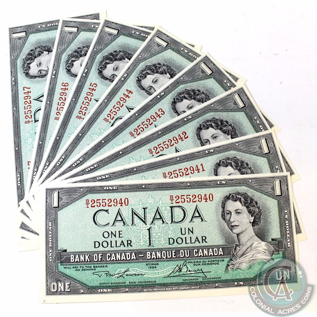 8 x 1954 $1.00 Notes with Lawson-Bouey Signatures and Consecutive Serial Numbers. 8 pcs