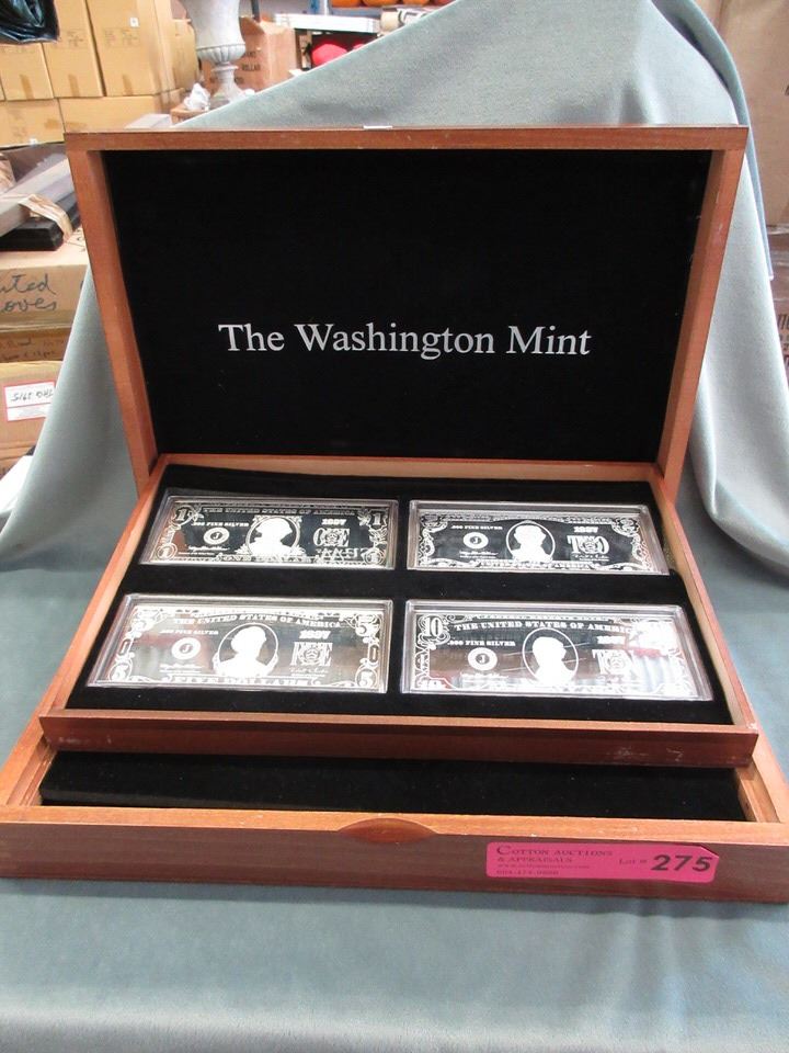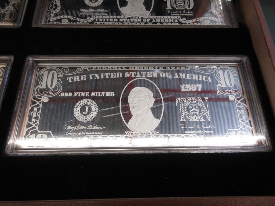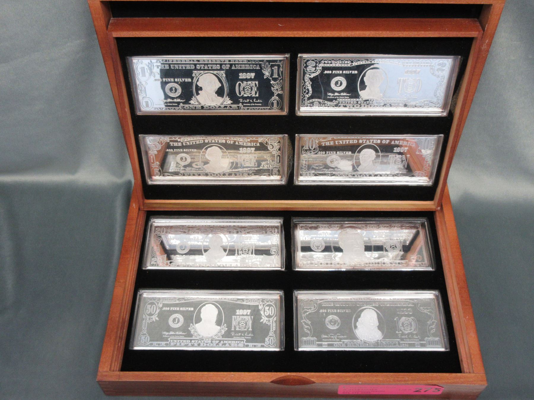 8 Bars for a total 32 Oz. of .999 Silver. US Currency motif. Wood Presentation Box. Tax exempt
