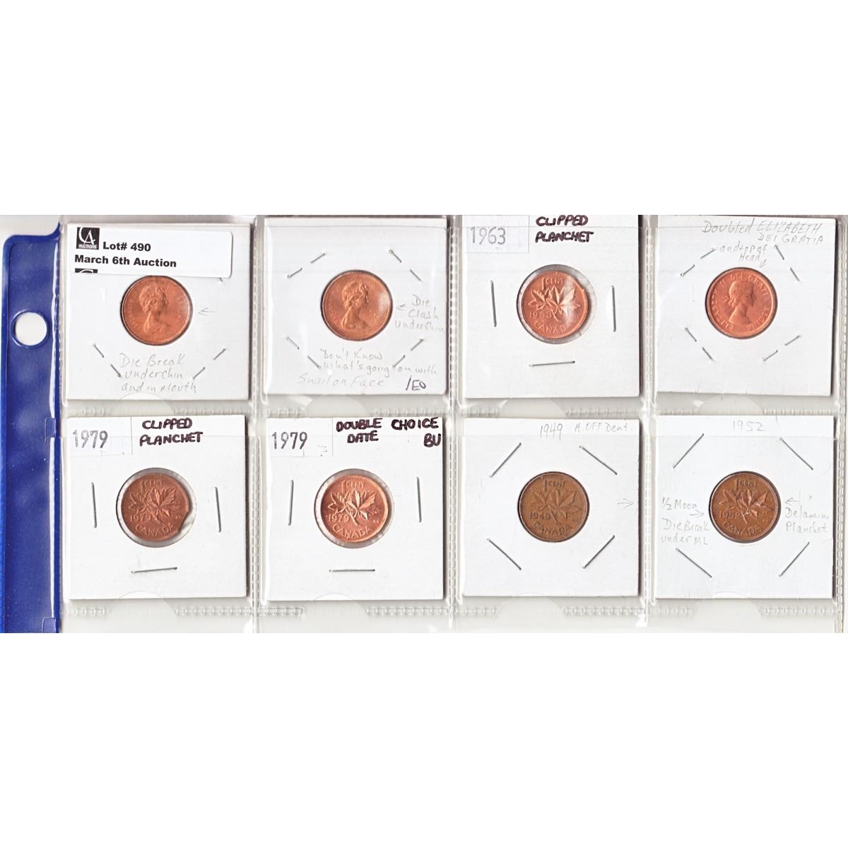 8 x Errors and Varieties on Canada 1-cents. As indicated on holders, please view picture. 8pcs. Buyers Premium will be added on all items as per our terms of sale. We accept Paypal, Credit Card, E-Transfer Payments, Cheque or Money Orders (there is an additional 3% fee for using Paypal or Credit Card). All invoices will be emailed immediately following the auction, please contact us if you would like to pay by credit card or receive a new revised lower total for mailing in payment or sending an e-transfer (3% discount). All Items Are Sold "AS IS", no returns