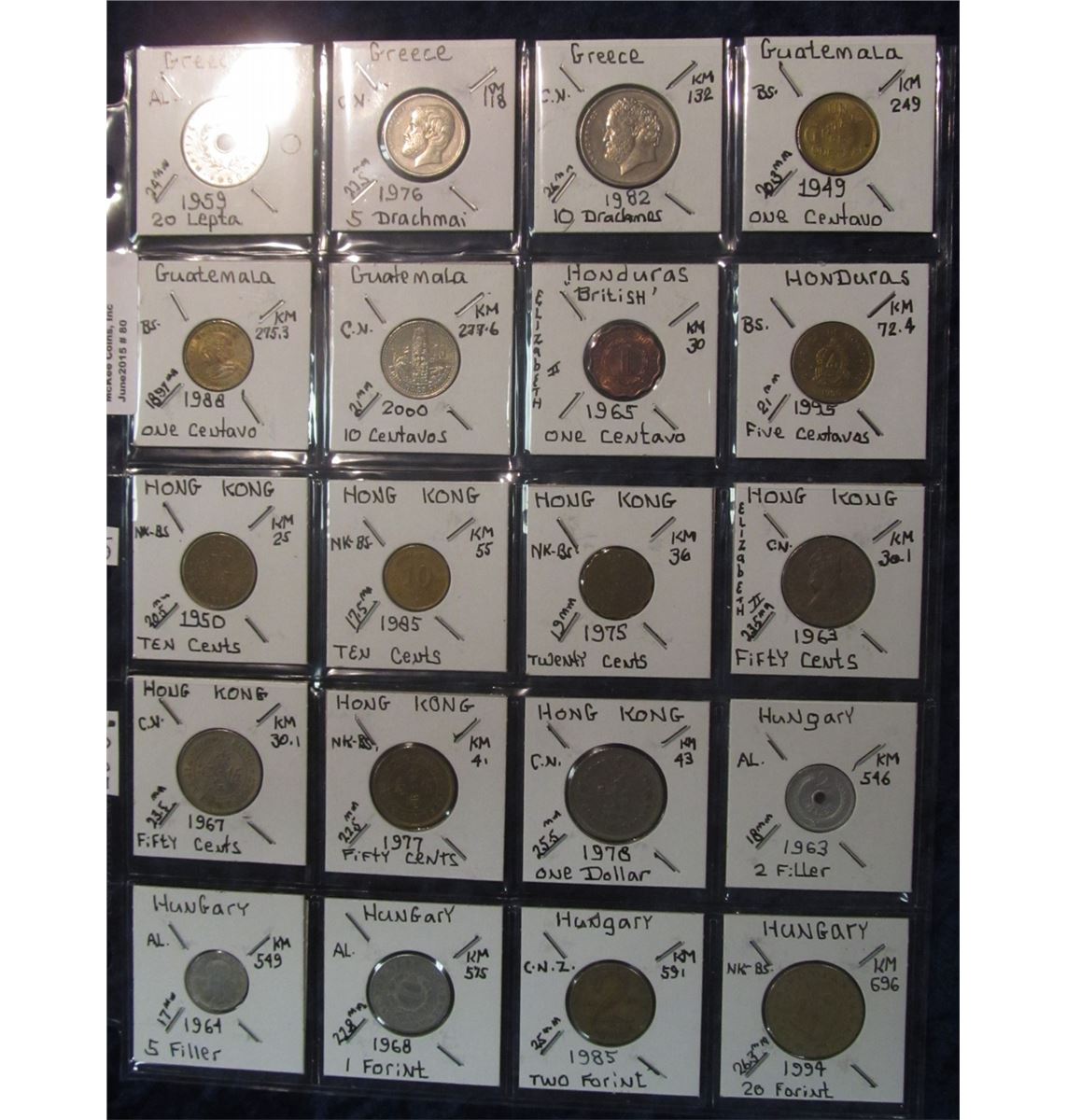 80. (20) World Coins in a Plastic Page identified with KM No., Metal size, & etc. All different. Includes: Greece, Guatemala, Honduras, Hong Kong, & Hungary. KM Value on this group is $9.85.