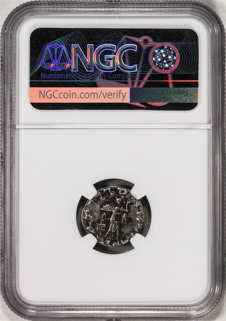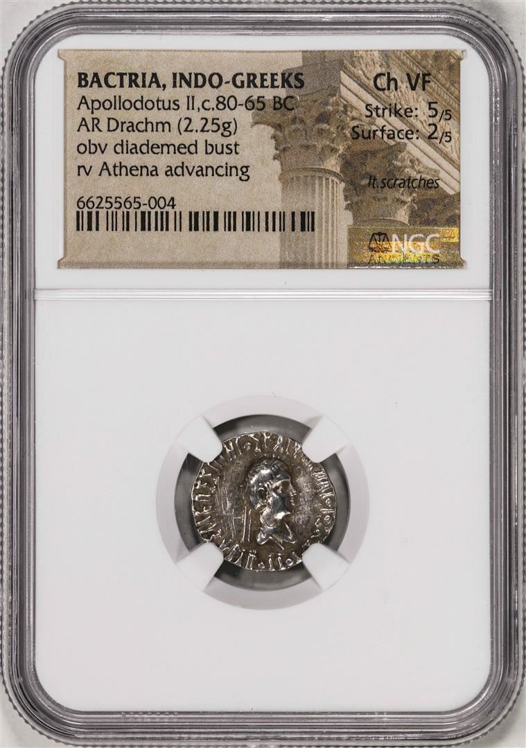 One 80-65 BC Bactria, Indo-Greeks Apollodotus II AR Drachm Ancient Coin NGC Ch VF. Diademed, draped bust of Apollodotus II right / Maharajasa tratarasa Apaladatasa (Kharosthi), Athena advancing left, brandishing thunderbolt in right hand, aegis across outstretched left arm; Kharosthi monogram in inner left field. NGC Certified.