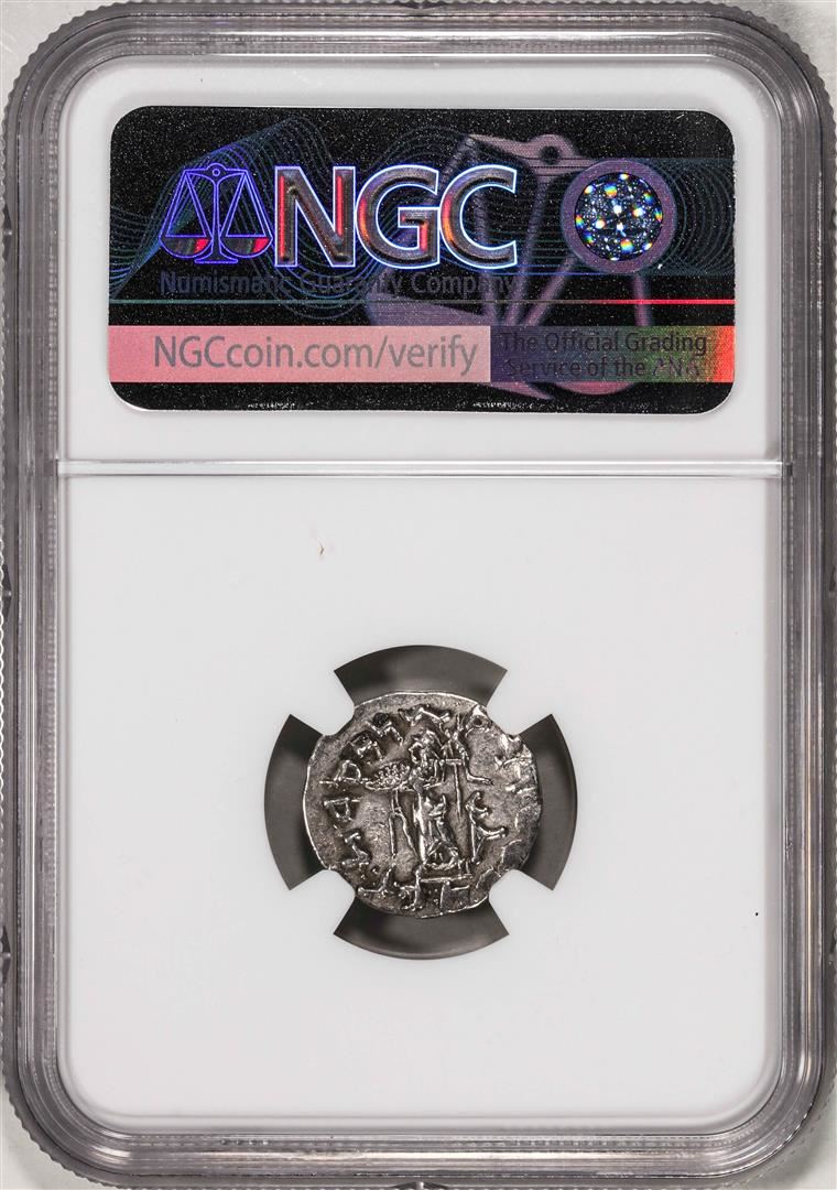 One 80-65 BC Bactria, Indo-Greeks Apollodotus II AR Drachm Ancient Coin NGC Ch XF. Diademed, draped bust of Apollodotus II right / Maharajasa tratarasa Apaladatasa (Kharosthi), Athena advancing left, brandishing thunderbolt in right hand, aegis across outstretched left arm; Kharosthi monogram in inner left field. NGC Certified.