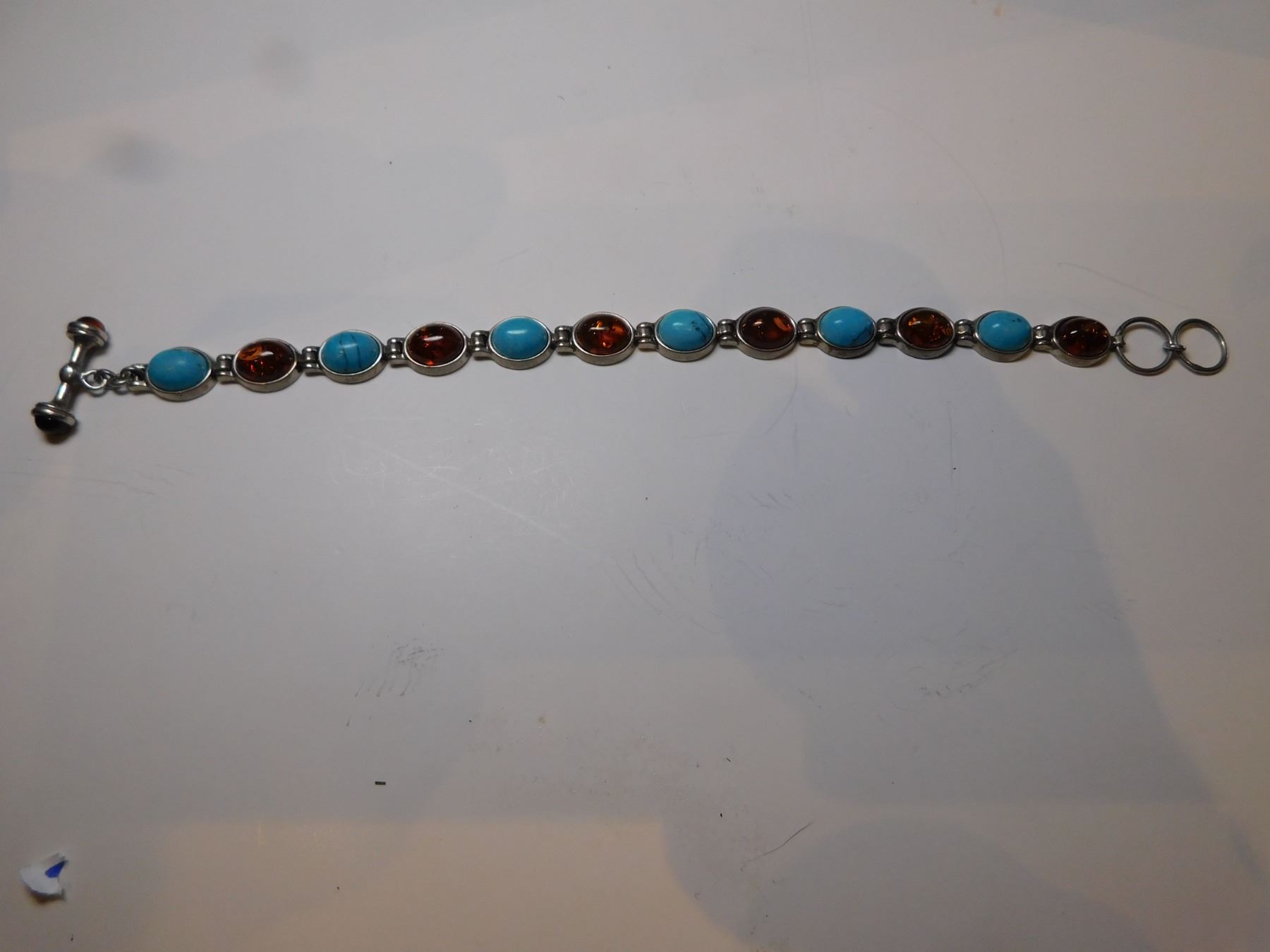 80. AMBER AND TURQUOISE STERLING SILVER BRACELET