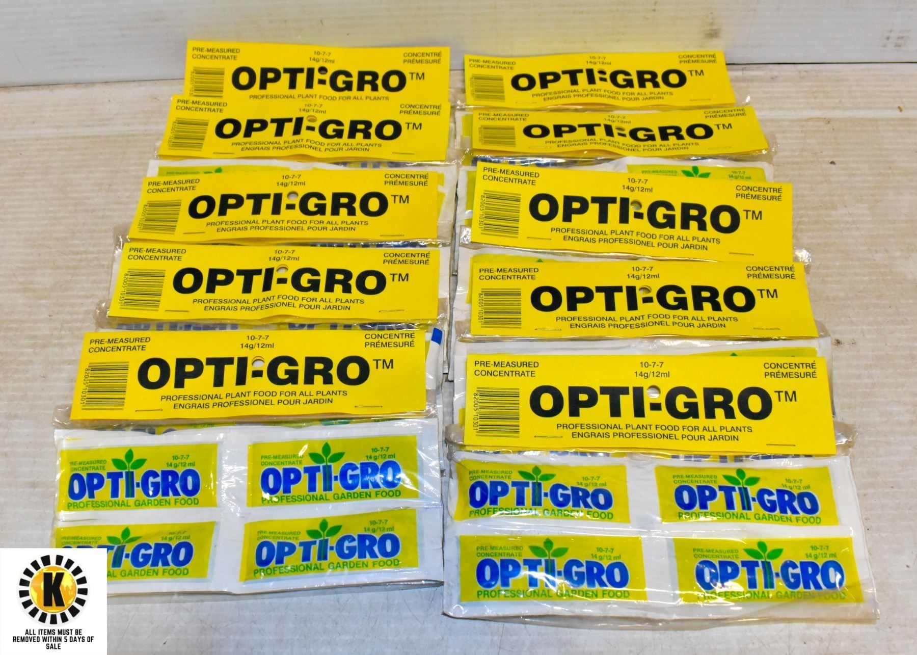 80 INDIVIDUAL PACKETS OF OPTI-GRO PROFESSIONAL GARDEN AND PLANT FOOD FOR ALL PLANTS 10-7-7. 10 BAGS WITH 8 INDIVIDUAL PACKETS 14GRAM IN EACH BAG. ALL ITEMS MUST BE REMOVED WITHIN 5 DAYS OF SALE