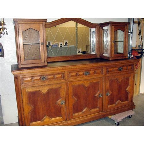 We have for sale a fabulous server. The server is made of oak. Has 3 drawers and 3 storage compartments with shelfs. On top there are 2 glass curior cabinets on each side of a diamond pattern mirror. The mirror is near mint condition for it's age. Although I do not know the exact age or date. There is a glass shelf in each curior cabinet along with a diamond parttern mirror on the back. The base of the server on the corner edge has an engraved design. The server has a lot of detail in the wood but is not over done. It weighs 195 pounds and measures 69.5 x 80 x 23. We do have more photographs that we can email if you are interested. And if you have any questions please contact us by email or telephone before you purchase the item. Please view our Terms of Sale and Shipping policy. We only ship to the continental U.S. We do have a retail store and there are times the item may be sold through our store. We try to remove items immediately or the next day at the latest. Mixup's are bound to occur and if this happens we apologize for the confusion
