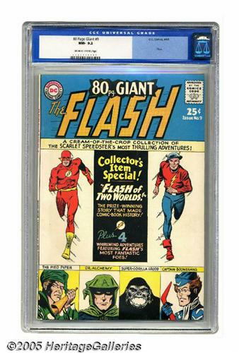<B>80 Page Giant #9 The Flash (DC, 1965) CGC NM- 9.2 Off-white to white pages.</B></I> Square bound. Reprints the "Flash of Two Worlds" story from <B>Flash</B></I> #123 plus four other Flash stories. Overstreet 2005 NM- 9.2 value = $245. CGC census 5/05: 5 in 9.2, 5 higher.