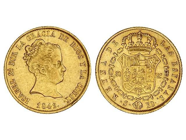 80 Reales. 1842/1. SEVILLA. R.D. (Golpecitos). Cal-91. MBC-/MBC.