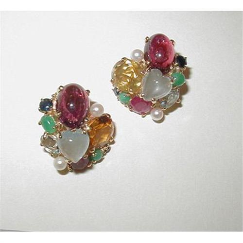VINTAGE GUMPS CLASSIC MULTI-GEM STONE EARRINGS SET IN 14K YELLOW GOLD WITH CLIP BACKS AND FLEXIBLE PAD. The earrings consist of: faceted oval gem citrine, oval cab pink tourmaline, cab heart-shape aquamarine, fine cultured pearl, oval faceted pink tourmaline, small oval faceted light aquamarine, small cab emerald & tiny round faceted sapphire. The earrings are 1 inch+ cluster and stamped 14K.