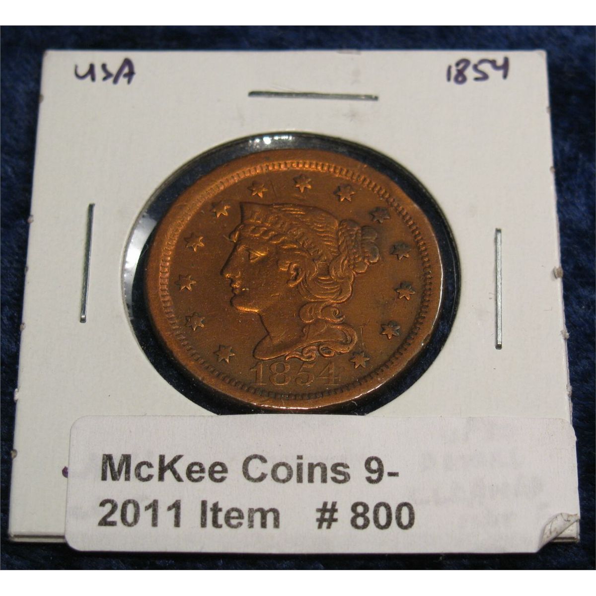 800. 1854 U.S. Large Cent. VF 30 details. Cleaned. Net F-12.