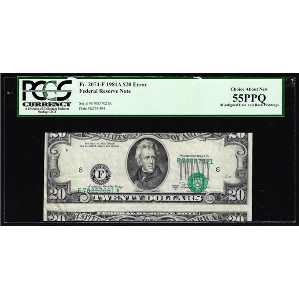 1981A $20 Federal Reserve Note Misaligned Face/Back Printing Error PCGS Choice AU55PPQ