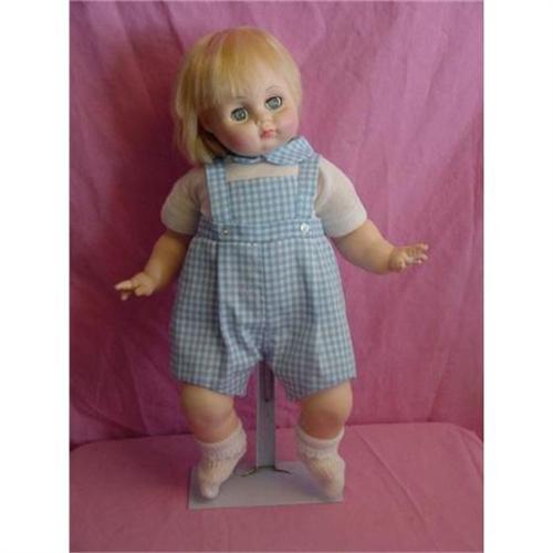 Vintage 1975 Mad Alex Little Brother, All Original, Excellent condition. Blonde hair and blue eyes, measures 20" tall. He has rosy complexion, sleep blue eyes, and pouty red lips. He is dressed in his original white shirt and blue gingham jumper.He is a very cute doll with his beautiful chubby arms and legs. A nice addition to your collection